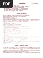 P (ntrerupndu-l i ducndu-i mna pe piept) Ca s scap de castravete, am s te-ascult la istorie! Vorbete-mi despre descoperirea Americii! I: Eh..Ameri-caAmerica a fost descoperit de ..de..Columb! P: Bine! I: Acolo, el, a dat de indieni! P: Biine!! I: ...care au ajuns srcii!! eh..au ajuns sraci. Ei nu mai aveau nici ce s mnnce, i erau nevoii s se hrneasc cu..cu P (ipnd, iritat ): Cu castravei?? I: (fericit) Da! Cu castravei de culoare galben verzuie, care face parte din familia curcubitaceelor, are tulpin n form de vrej, se nmulete prin semine i are peste 98% ap... GATA!(zmbind) P: Simt c-nebunesc, prostovane! Mai fac o singur-ncercare cu tine. S trecem la geografie! S-mi spui ce tii despre Canalul de Suez! I: Canalul de suez ..[Link] de suez este foarte mare! i foarte lung! aaaiiiel este n form de de. P (curios, calm): De ce? I (zmbind): De dovlecel! P (respirnd uurat, aezndu-se): De dovle-cel! Zi! I: Canalul de suez, pe lng faptul c e foarte mare i foarte lung, ai foarte lung, i este n form de dovlecel, sese aseamn foarte mult cu P (intrigat): Cu ce, m? I (zmbind bucuros): Cu o vn-t ! Aalocuitorii care triesc pe lng canalul de Suez aaase hrnesc cu cu P: Cu ce ? I (dnd din umeri): Cu ..banane ..cu portocale, c doar n-o s se hrneasc cu castrave i (rde ) Hi hi..c un castravetetim i noi c un castravete este un fruct dicotiledonat de culoarea galben-verzuie, face parte din familia curcubitaceelor, are tulpin n form de vrej, se nmulete prin semine i P (ntrerupndu-l, pierzndu-i rbdarea): Altceva nu mai tii despre canalul de Suez?? I (convingtor): Ba da!! C are peste 98 % ap!! (clasa toat rde).