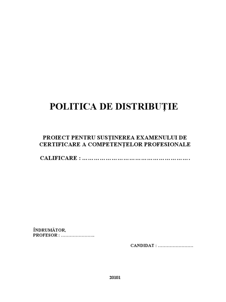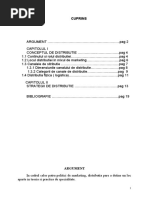 Am ales s realizez proiectul pentru obinerea certificatului de competene profesionale, pe tema Politicii de distribuie deoarece mi-a creat o viziune strategic din punct de vedere economic pentru realizarea celor mai bune afaceri i profituri. Politica de distribuie, ca parte a mixului de marketing, reprezint ansamblul deciziilor economice i tehnice ce duc la derularea performant a activitilor necesare i a relaiilor ce se stabilesc ntre agenii economici n vederea punerii mrfurilor la dispoziia utilizatorilor fizici. Distrubuia se refer la circuitul fizic i economic al mrfurilor, la sistemul de relaii ce intervin ntre agenii de pe pia de mase largi i eterogene de uniti aparinnd mai multor ramuri economice. Elementul central al distribuiei este reprezentat de canalul de distribuie. Acesta este neles drept un ansamblu coerent de uniti i funciuni asigurate de agenii economici ce deruleaz un fascicul de fluxuri ntre cele dou capete ale canalului. Logistica comercial reprezint micarea i manipularea bunurilor economice de la locul unde sunt produsele la cel n care sunt utilizate/consumate, precum i toate activitile adiacente antrenate de acest proces. Principalul obiectiv al logisticii comerciale este asigurarea serviciilor de natura distribuiei n conformitate cu cerinele utilizatorilor. Aceast lucrare este structurat pe mai multe capitole, pe parcursul crora am ncercat s clarific concepte precum: politica de distribuie, canalul de distribuie, logistic, intermediari, strategii de distribuie; dup cum urmeaz: - Capitolul I : Politica de distribuie 1. Conceptul de distribuie 2. Coninutul i rolul distribuiei - Capitolul II : Canalul de distribuie 1. Definiia, obiectivele i caracteristicile canalului de distribuie 2. Tipuri de canale de distribuie 3. Tendine n evoluia distribuiei - Capitolul III : Strategii n politica de distribuie