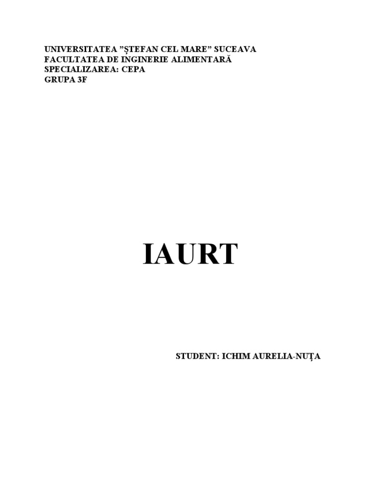 Iaurtul este considerat alimentul sntos din familia lactatelor. Este considerat unul din alimentele care ajut la prelungirea vieii. De obicei, iaurtul este corelat cu efectele sale benefice asupra organismului, iar muli l consum drept adjuvant al digestiei. Iaurtul este produs lactat fabricat prin fermentarea laptelui cu culturi starter de Streptococcus thermophilus i Lactobacillus delbrueckii subsp. bulgaricus sau culturi de Streptococcus thermophilus i orice specie de Lactobacillus. Iaurtul este un produs lactat rezultat din fermentarea laptelui. Orice fel de lapte poate fi folosit pentru a produce iaurt, dar n ziua de azi, laptele de vac este cel mai des folosit. Iaurtul are o textur ca un gel i un gust puin acrior din cauza fermentrii zahrului din lapte (lactoz) n acid lactic. Cuvntul vine de la yourt n turcete care se trage de la verbul yourtmak - a combina. Iaurtul i are originea n Asia sau n Europa de est i a aprut ca rspuns la nevoia de a conserva laptele peste cele cteva ore care urmau mulsului. Astfel a nceput aventura descoperirii nenumratelor avantaje nutriionale i medicale pe care le deine. Coagularea laptelui a fost, desigur, descoperit absolut din ntmplare. n foarte multe ri, Grecia, Turcia, Mongolia sau India, consumarea iaurtului face parte din tradiie, dar ncepnd cu anii '20 ai secolului al XX-lea, iaurtul se rspndete i n Europa Occidental 1.1. Materia prim folosit la fabricarea iaurtului Laptele este un lichid de culoare alb-glbuie secretat de glanda mamar a [Link] punct de vedere fizic,laptele reprezint un sistem complex, putnd fi considerat o emulsie de tipul U/A,n care U reprezint faza gras format din globule de grsime, iar A faza apoas care conine substane sub form coloidal (proteinele) sau sub form dizolvat (lactoz,sruri minerale,vitamine hidrosolubile). Faza gras conine i vitaminele liposolubile,care pot fi legate i de proteine, n principal de cazein. Calitatea laptelui folosit la prepararea produselor lactate acide-dietetice determin n mare msur calitatea produselor finite. Rezult c trebuie recepionat numai laptele de prim prospeime, deci cu un grad de contaminare ct mai redus i cu o compoziie normala (se exclude laptele care conine i colostru, lapte falsificat, lapte provenit de la animale tratate cu antibiotice, lapte mamitic).