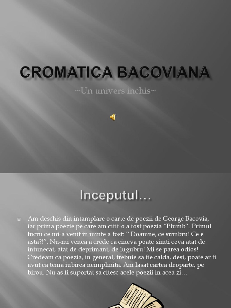 Am deschis din intamplare o carte de poezii de George Bacovia, iar prima poezie pe care am citit-o a fost poezia Plumb. Primul lucru ce mi-a venit in minte a fost: Doamne, ce sumbru! Ce e asta?!. Nu-mi venea a crede ca cineva poate simti ceva atat de intunecat, atat de deprimant, de lugubru! Mi se parea odios! Credeam ca poezia, in general, trebuie sa fie calda, desi, poate ar fi avut ca tema iubirea neimplinita. Am lasat cartea deoparte, pe birou. Nu as fi suportat sa citesc acele poezii in acea zi