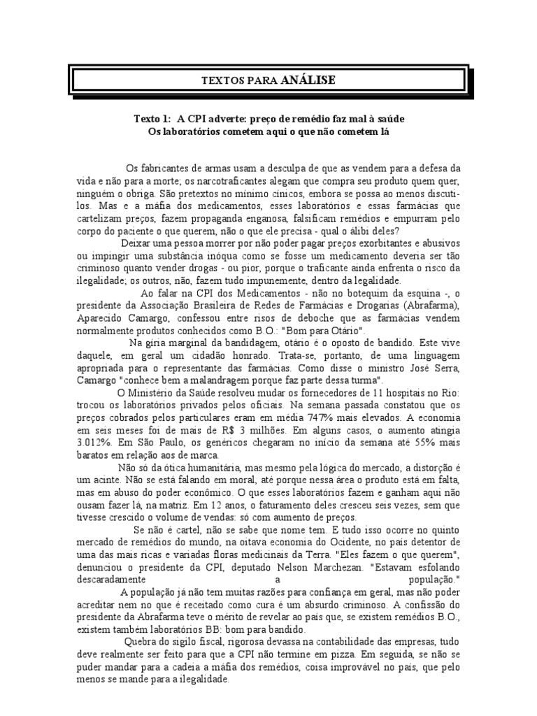 e no cometem l Os fabricantes de armas usam a desculpa de que as vendem para a defesa da vida e no para a morte; os narcotraficantes alegam que compra seu produto quem quer, ningum o obriga. So pretextos no mnimo cnicos, embora se possa ao menos discutilos. Mas e a mfia dos medicamentos, esses laboratrios e essas farmcias que cartelizam preos, fazem propaganda enganosa, falsificam remdios e empurram pelo corpo do paciente o que querem, no o que ele precisa - qual o libi deles? Deixar uma pessoa morrer por no poder pagar preos exorbitantes e abusivos ou impingir uma substncia inqua como se fosse um medicamento deveria ser to criminoso quanto vender drogas - ou pior, porque o traficante ainda enfrenta o risco da ilegalidade; os outros, no, fazem tudo impunemente, dentro da legalidade. Ao falar na CPI dos Medicamentos - no no botequim da esquina -, o presidente da Associao Brasileira de Redes de Farmcias e Drogarias (Abrafarma), Aparecido Camargo, confessou entre risos de deboche que as farmcias vendem normalmente produtos conhecidos como B.O.: "Bom para Otrio". Na gria marginal da bandidagem, otrio o oposto de bandido. Este vive daquele, em geral um cidado honrado. Trata-se, portanto, de uma linguagem apropriada para o representante das farmcias. Como disse o ministro Jos Serra, Camargo "conhece bem a malandragem porque faz parte dessa turma". O Ministrio da Sade resolveu mudar os fornecedores de 11 hospitais no Rio: trocou os laboratrios privados pelos oficiais. Na semana passada constatou que os preos cobrados pelos particulares eram em mdia 747% mais elevados. A economia em seis meses foi de mais de R$ 3 milhes. Em alguns casos, o aumento atingia 3.012%. Em So Paulo, os genricos chegaram no incio da semana at 55% mais baratos em relao aos de marca. No s da tica humanitria, mas mesmo pela lgica do mercado, a distoro um acinte. No se est falando em moral, at porque nessa rea o produto est em falta, mas em abuso do poder econmico. O que esses laboratrios fazem e ganham aqui no ousam fazer l, na matriz. Em 12 anos, o faturamento deles cresceu seis vezes, sem que tivesse crescido o volume de vendas: s com aumento de preos. Se no cartel, no se sabe que nome tem. E tudo isso ocorre no quinto mercado de remdios do mundo, na oitava economia do Ocidente, no pas detentor de uma das mais ricas e variadas floras medicinais da Terra. "Eles fazem o que querem", denunciou o presidente da CPI, deputado Nelson Marchezan. "Estavam esfolando descaradamente a populao." A populao j no tem muitas razes para confiana em geral, mas no poder acreditar nem no que receitado como cura um absurdo criminoso. A confisso do presidente da Abrafarma teve o mrito de revelar ao pas que, se existem remdios B.O., existem tambm laboratrios BB: bom para bandido. Quebra do sigilo fiscal, rigorosa devassa na contabilidade das empresas, tudo deve realmente ser feito para que a CPI no termine em pizza. Em seguida, se no se puder mandar para a cadeia a mfia dos remdios, coisa improvvel no pas, que pelo menos se mande para a ilegalidade.