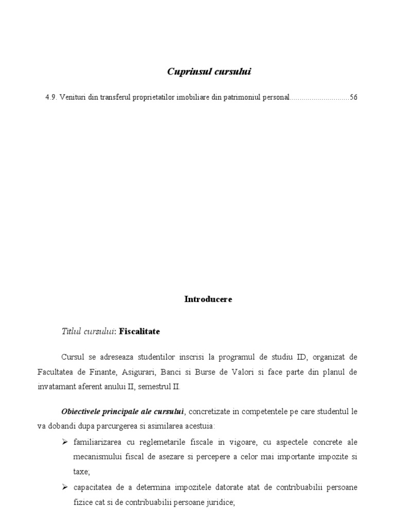 valorificarea cunostintelor specifice domeniului pentru explicarea si solutionarea unor situatii practice. Cursul este structurat pe 8 unitati de invatare (capitole), cuprinzand: aspecte teoretice si practice privind mecanismul de asezare si percepere a celor mai importante impozite directe si indirecte; teste de evaluare/autoevaluare a cunostintelor. Evaluarea cunostintelor se va realiza sub doua forme: evaluare continua, pe baza lucrarilor de verificare propuse la sfarsitul fiecarei unitati de invatare; evaluare finala, realizata prin examenul sustinut in sesiunea de evaluare. Criteriile de evaluare constau in: ponderea evaluarilor pe parcursul semestrului (teme de control) - 40%; ponderea evaluarii finale 60%.