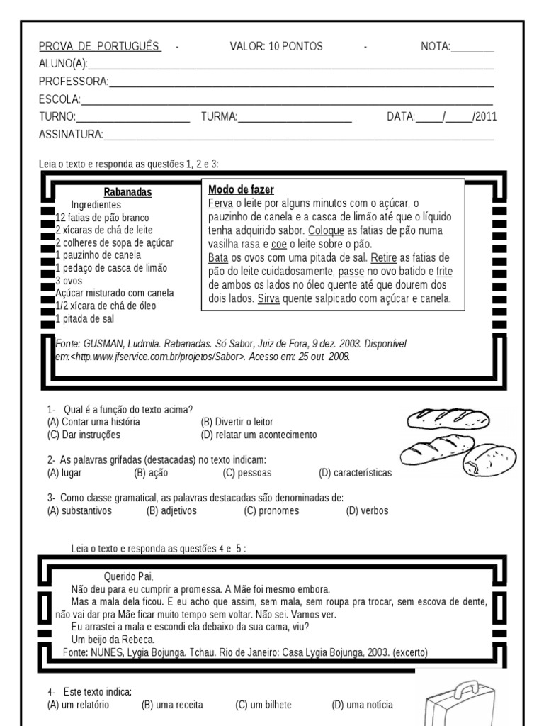 3- Como classe gramatical, as palavras destacadas so denominadas de: (A) substantivos (B) adjetivos (C) pronomes (D) verbos Leia o texto e responda as questes 4 e 5 : Querido Pai, No deu para eu cumprir a promessa. A Me foi mesmo embora. Mas a mala dela ficou. E eu acho que assim, sem mala, sem roupa pra trocar, sem escova de dente, no vai dar pra Me ficar muito tempo sem voltar. No sei. Vamos ver. Eu arrastei a mala e escondi ela debaixo da sua cama, viu? Um beijo da Rebeca. Fonte: NUNES, Lygia Bojunga. Tchau. Rio de Janeiro: Casa Lygia Bojunga, 2003. (excerto) 4- Este texto indica: (A) um relatrio (B) uma receita
