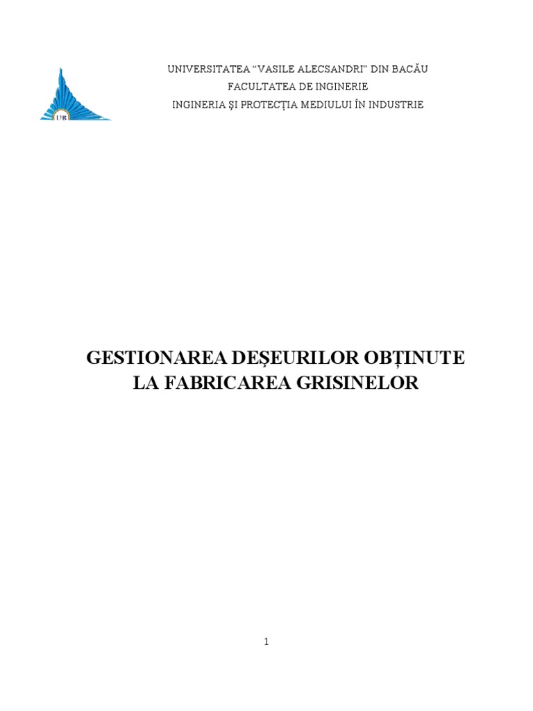 Capitolul 1 INTRODUCERE......................................................................................... 4 1.1. Introducere despre industria alimentar..........................................................4 [Link] produselor fainoase i de patiserie.....................................................5 Capitolul 2 PROCESUL TEHNOLOGIC PENTRU FABRICAREA GRISINELOR...................7 2.1 Dozarea materiilor prime................................................................................... 7 2.2 Frmntarea aluatului...................................................................................... 8 2.3. Fermentarea aluatului...................................................................................... 9 2.4. Prelucrarea aluatului...................................................................................... 11 2.5. Dospirea final............................................................................................... 13 2.6. Coacerea........................................................................................................ 13 2.7. Rcirea........................................................................................................... 14 2.8. Ambalarea...................................................................................................... 14 2.9. Schema tehnologic de fabricare a grisinlor..................................................15 Capitolul 3 SCHEMA DE GENERARE A DEEURILOR N PRODUCEREA GRISINELOR...16 Capitolul 4 SCURTA DESCRIERE A DEEURILOR OBINUTE......................................17 Capitolul 5 GESTIONAREA DEEULUI ALES...............................................................19