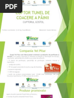 2.6. Coacerea Dup dospire aluatul este trecut la coacere care se face de obicei n cuptoare continue. La unele instalaii de coacere s-au nlocuit tvile prin leagne cu canale, pe care se ncarc direct aluatul, n acest caz conveierul dospitorului final se continu n [Link] faptului c prin coacere aluatul sufer transformri care definitiveaz caracteristicile produsului finit, defeciunile tehnologice produse n aceast faz conduc la rebutarea loturilor respective. Acest fapt oblig la manifestarea unei mari atenii fa de calitatea aluatului i condiiile de coacere [1]. Coacerea grisinelor se face n cuptoare tip conveier (figura 2.4) adaptate, dup caz, pentru coacere pe tvi sau direct pe suprafaa leagnului [1].
