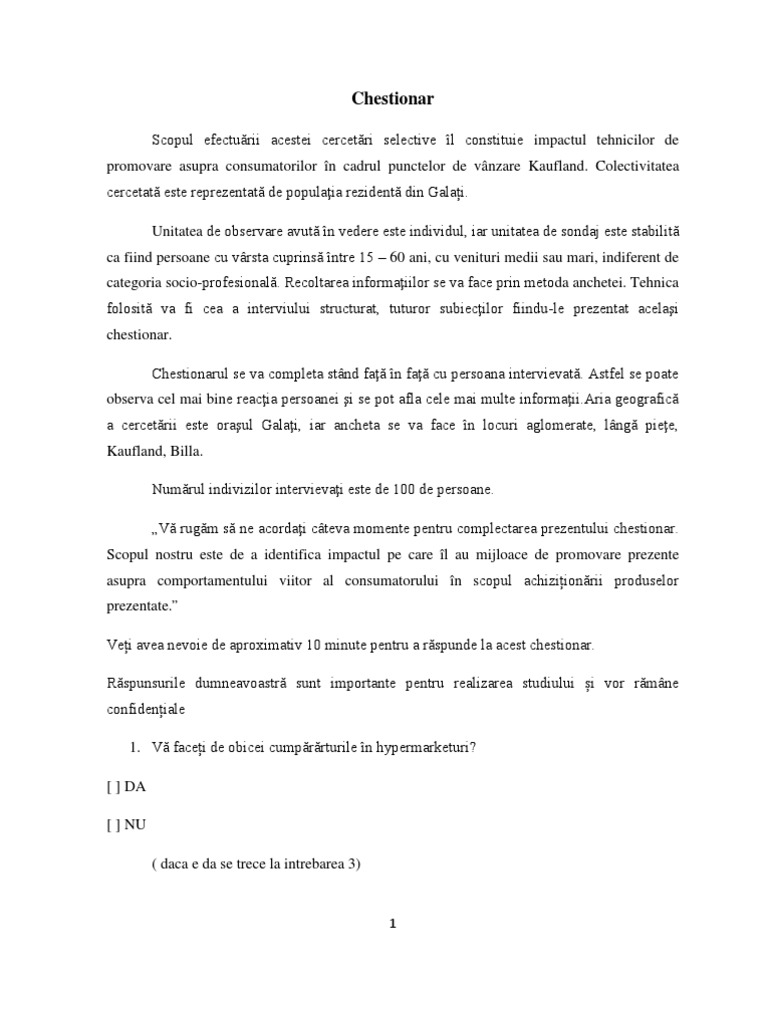 Scopul efecturii acestei cercetri selective l constituie impactul tehnicilor de promovare asupra consumatorilor n cadrul punctelor de vnzare Kaufland. Colectivitatea cercetat este reprezentat de populaia rezident din Galai. Unitatea de observare avut n vedere este individul, iar unitatea de sondaj este stabilit ca fiind persoane cu vrsta cuprins ntre 15 60 ani, cu venituri medii sau mari, indiferent de categoria socio-profesional. Recoltarea informaiilor se va face prin metoda anchetei. Tehnica folosit va fi cea a interviului structurat, tuturor subiecilor fiindu-le prezentat acelai chestionar. Chestionarul se va completa stnd fa n fa cu persoana intervievat. Astfel se poate observa cel mai bine reacia persoanei i se pot afla cele mai multe [Link] geografic a cercetrii este oraul Galai, iar ancheta se va face n locuri aglomerate, lng piee, Kaufland, Billa. Numrul indivizilor intervievai este de 100 de persoane. V rugm s ne acordai cteva momente pentru complectarea prezentului chestionar. Scopul nostru este de a identifica impactul pe care l au mijloace de promovare prezente asupra comportamentului viitor al consumatorului n scopul achiziionrii produselor prezentate. Vei avea nevoie de aproximativ 10 minute pentru a rspunde la acest chestionar. Rspunsurile dumneavoastr sunt importante pentru realizarea studiului i vor rmne confideniale 1. V facei de obicei cumprrturile n hypermarketuri? [ ] DA [ ] NU ( daca e da se trece la intrebarea 3)