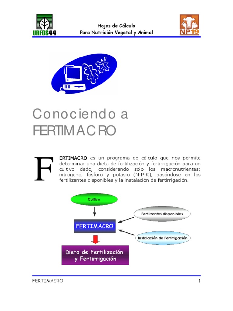 ERTIMACRO es un programa de clculo que nos permite determinar una dieta de fertilizacin y fertirrigacin para un cultivo dado, considerando solo los macronutrientes: nitrgeno, fsforo y potasio (N-P-K), basndose en los fertilizantes disponibles y la instalacin de fertirrigacin.