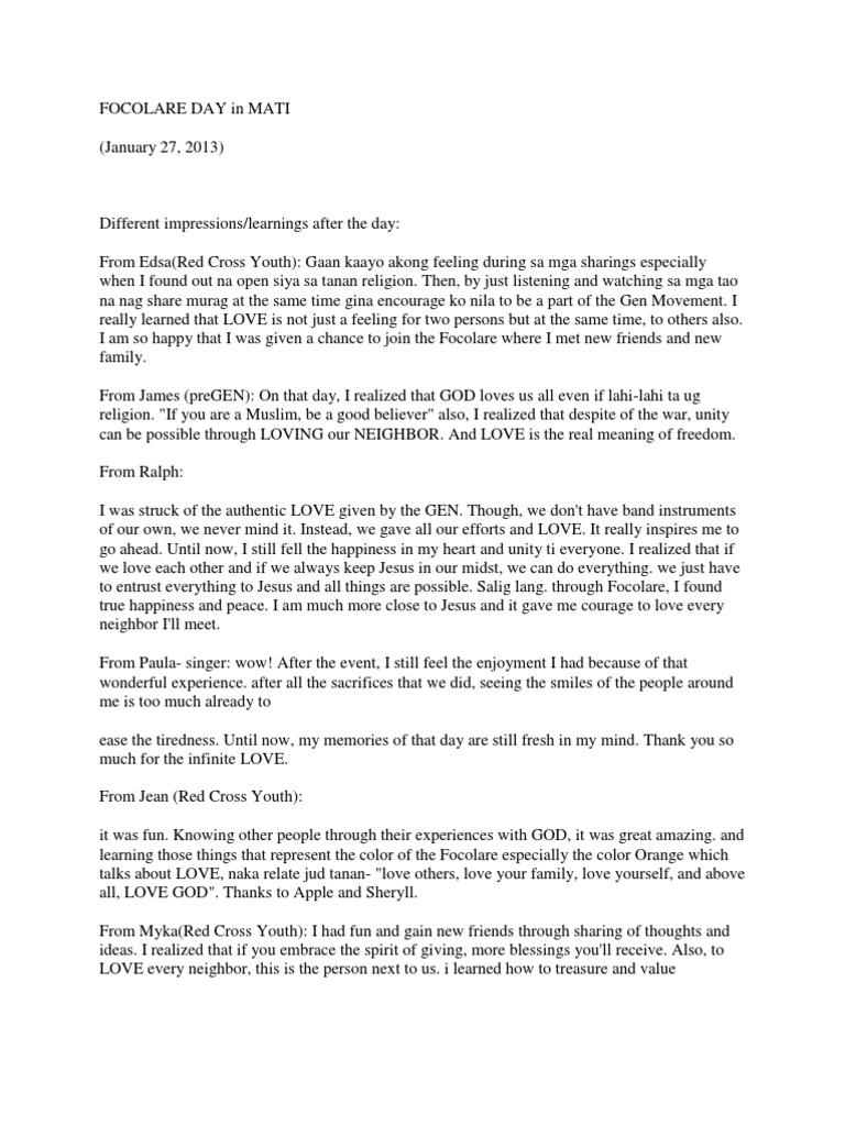 friendship, not to lose hope because GOD will never forsake us and the most thing is to "LOVE ANE ANOTHER AS GOD LOVES US". Focolare Movement rocks! From Leah Mae(preGEN): I really had fun during that Focolare Day. I've met lot of people that I was happen to share thoughts, ideas, SMILE, and LOVE. I learned many things like "when you give, you don't need to expect something on return", and "LOVE ALL". It made me realized that I really need to change myself for a better individual. I never regret in attending the Focolare day because I felt the sincerity of the program, the belongingness, the family, the appreciation, and the LOVE, despite of the limited time. May we always keep JESUS in our midst. From Jonabell(dancer): Focolare day is one of the events that I will never forget. the experiences, videos, and songs were so meaningful that I felt happiness inside. i was so happy seeing the invitees' genuine smile. There I learned more the essence and real meaning of LOVE to our brothers and sisters in simple way. it made me become a better GEN. From Jane(emcee): with my experience in the Focolare day, I've proven something that despite of the differences we people have, we can conquer any hardship and with unity and LOVE, we can reach out even to the most queer people.