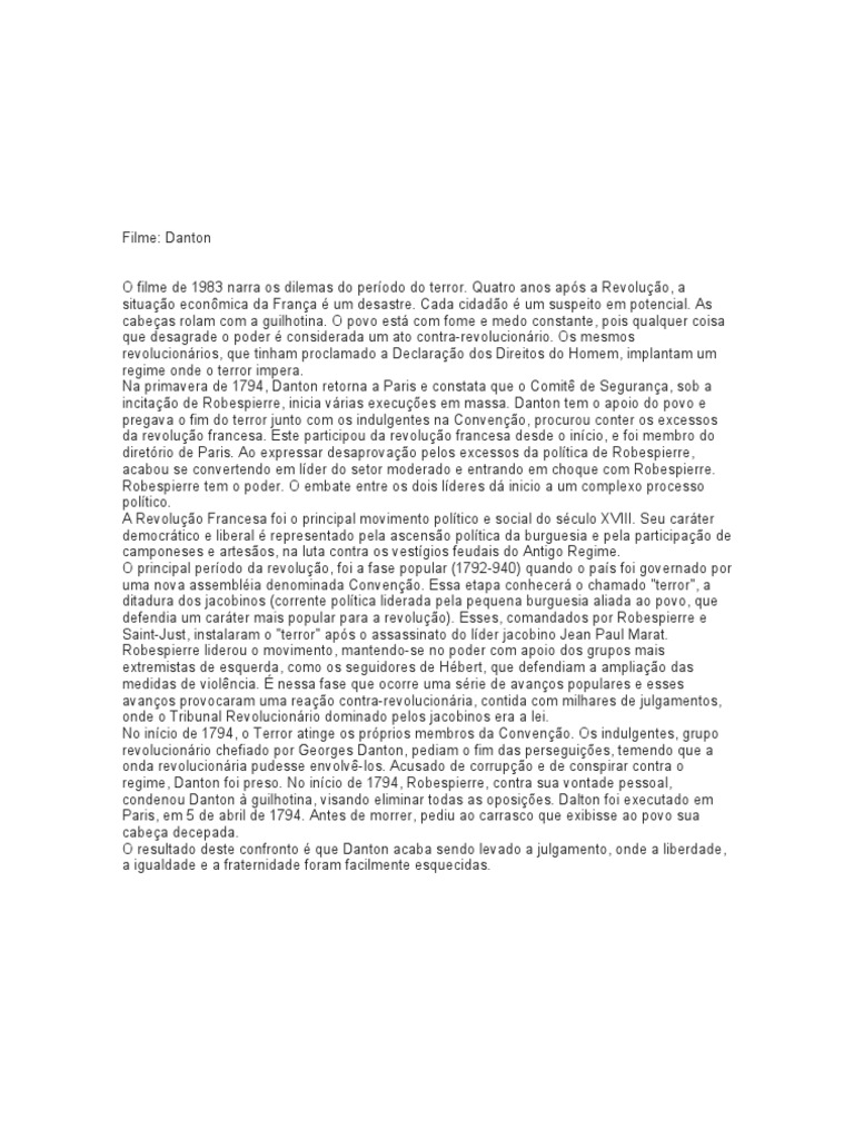 Este filme retrata uma passagem da Revoluo Francesa, a fase do terror, comandada por Robespierre. Liberdade, Igualdade e Fraternidade era o lema da revoluo, mas no era desta forma que a populao francesa vivia. Em 1794, a Frana estava sob o jugo do Tribunal Revolucionrio. Ningum podia se opor ao soberano porque era considerado contra-revolucionrio. O Tribunal Revolucionrio enviou milhares de pessoas para a guilhotina. neste ano que Danton (Grard Depardieu) chega em Paris e presencia o terror instaurado por Robespierre (Wojciech Pszoniak), seu companheiro durante a revoluo. Ao tentar realizar mudanas, com o apoio de alguns revolucionrios e do povo, foi considerado uma ameaa aos jacobinos (baixa burguesia aliada ao povo) e teve que enfrentar o Tribunal Revolucionrio. Segundo Jean Jacques Rousseau, a Repblica um contrato feito pelos sditos com o soberano, ou seja, o soberano deve exercer o seu poder em favor dos interesses dos seus sditos. Mas o filme mostra uma Repblica que foi estabelecida sem sua principal essncia. No havia liberdade de expresso para o povo, pois eles no podiam contestar o soberano. Tambm no havia igualdade e fraternidade, pois o pas passava por dificuldades econmicas, o povo vivia na misria e eram tratados como animais. Um aspecto importante retratado pelo filme o fato de que Robespierre agia acima das leis, ditando regras sem se preocupar com as convenes. Esta atitude desrespeitava o processo de institucionalizao e no passava confiana para o povo, que passou a no acreditar nas leis e nas instituies. Duas cenas do filme chamam a ateno para o processo natural do qual Rousseau falava (O homem nasce livre, e por toda a parte encontra-se a ferros): um menino n est em uma banheira e a mulher, que lhe dava banho, o obrigava a decorar as leis da Repblica e no final do filme ele aparece ao lado de Robespierre falando tudo que havia decorado e vestido com uma roupa no mais de criana, mas de um homem.