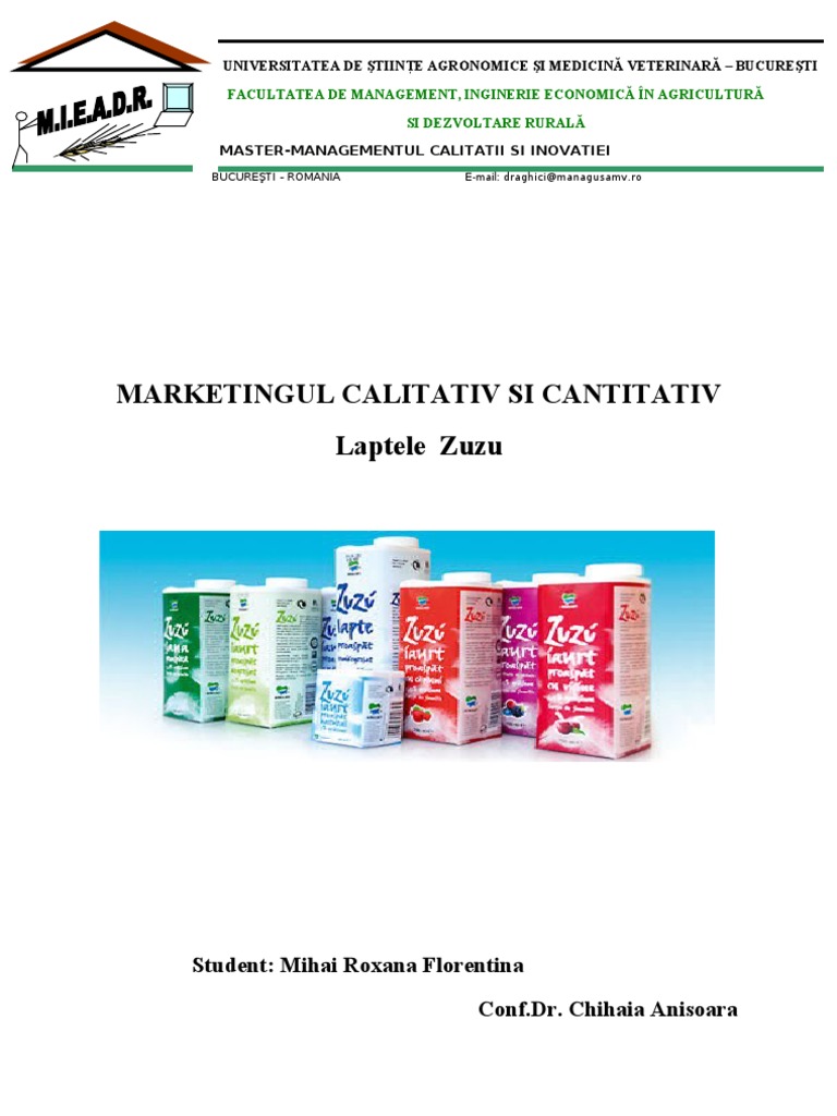 Majoritatea consumatorilor de produse lactate au vrsta cuprins ntre 26 i 34 de ani. Majoritatea consumatorilor de produse lactate sunt persoane de sex feminin . Majoritatea consumatorilor de produse lactae sunt angajai i au venituri lunare ce depesc 1.500 ron/lun. Cca. 10% dintre persoanele care nu consum produse lactate, nu consum datorit faptului c sunt carnivori. Cca. 75% dintre persoanele care consum produse din carne sunt mulumite de produsele pe care le achiziioneaz. Cei mai muli dintre indivizi au n vedere calitatea i preul produselor achiziionate. Indivizii sunt foarte influenai de publicitate, n decizia de achiziionare a produselor lactate. Varianta de ambalaj la 400 de grame este preferat cu precdere de 85% din consumatori. CHESTIONAR PRIVIND CONSUMUL DE PRODUSE LACTATE ZUZU Bun ziua, doamn / domnule