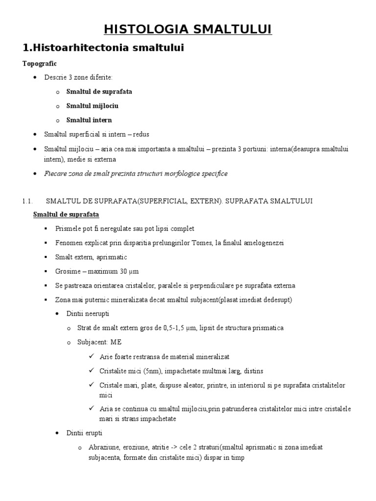 o Pirikimata si ridicaturile dispuse continuu de jur imprejurul coroanei, paralal unele cu altele si cu jonctiunea amelocementara o ME de baleiaj densitate perikimata o Jonctiune alemocementara: 30/mm2 o Spre suprafata ocluzala, cuspidiana sau incizala: 10/mm2 -> disparitie completa, datorita fortelor de masticatie c. Capetele treminale ale prismelor Mici depresiuni concave, diferite ca forma si adancime Observate cel mai frecvent pe zonele bombate dintre perikimata Adancimea creste dinspre zona cervicala spre zona ocluzala/incizala d. Lamelele smaltului ~ Structuri subtiri, liniare sau cu aspect de frunza ~ Se extind de la suprafata smaltului spre jonciunea amelodentinara, uneori chiar patrunzand in dentina ~ Orintare longitudidal si radiar in dinte, in toata grosimea smaltului ~ Apar datorita unor defecte de mineralizare ~ Formate din material organic -> continut mineral redus ~ Se dezvolta in planurile de tensiune -> cand prismele traverseaza un astfel de plan, un segment scurt al prismei poate sa nu fie calcificat in totalitate ~ Defect sever -> apare un spatiu care se umplae fie cu celulele din zona inconjuratoare( la dintele neerupt), fie cu substante organice din cavitatea orala (dupa eruptie) ~ Sectiuni slif confundata cu fisurile; demineralizare: diferentiere posibila: lamelele persista, fisurile dispar ~ Tipuri de lamele: Tipul A, formate datorita existentei unor segmente de prisme slab mineralizate; contin in principalmaterial organic proteine ale smaltului; localizate strict la nivelul smaltului Tipul B, formate prin acumulare ade celule degenerate, se pot extinde si la nivelul dentinei Tipul C, formate in dintele erupt (cele mai frecvente), acolo unde spatiu format intr-o zona slab mineralizata se umple cu material organic probabil de origine salivara; se pot extinde si la nivelul dentinei