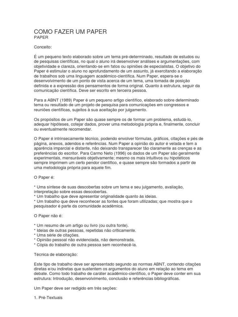 PAPER Conceito: um pequeno texto elaborado sobre um tema pr-determinado, resultado de estudos ou de pesquisas cientficas, no qual o aluno ir desenvolver anlises e argumentaes, com objetividade e clareza, orientando-se em fatos ou opinies de especialistas. O objetivo do Paper estimular o aluno no aprofundamento de um assunto, j exercitando a elaborao de trabalhos sob uma linguagem acadmico-cientfica. Num Paper, espera-se o desenvolvimento de um ponto de vista acerca de um tema, uma tomada de posio definida e a expresso dos pensamentos de forma original. Quanto estrutura, seguir da comunicao cientfica. Deve ser escrito em terceira pessoa. Para a ABNT (1989) Paper um pequeno artigo cientfico, elaborado sobre determinado tema ou resultado de um projeto de pesquisa para comunicaes em congressos e reunies cientficas, sujeitos sua aceitao por julgamento. Os propsitos de um Paper so quase sempre os de formar um problema, estud-lo, adequar hipteses, cotejar dados, prover uma metodologia prpria e, finalmente, concluir ou eventualmente recomendar. O Paper intrinsecamente tcnico, podendo envolver frmulas, grficos, citaes e ps de pgina, anexos, adendos e referncias. Num Paper a opinio do autor velada e tem a aparncia imparcial e distante, no deixando transparecer to claramente as crenas e as preferncias do escritor. Para Carmo Neto (1996) os dados de um Paper so geralmente experimentais, mensurveis objetivamente; mesmo os mais intuitivos ou hipotticos sempre imprimem um certo pendor cientifico, e quase sempre so formados a partir de uma metodologia prpria para aquele fim. O Paper : * Uma sntese de suas descobertas sobre um tema e seu julgamento, avaliao, interpretao sobre essas descobertas. * Um trabalho que deve apresentar originalidade quanto s ideias. * Um trabalho que deve reconhecer as fontes que foram utilizadas; que mostra que o pesquisador parte da comunidade acadmica. O Paper no : * Um resumo de um artigo ou livro (ou outra fonte). * Ideias de outras pessoas, repetidas no criticamente. * Uma srie de citaes. * Opinio pessoal no evidenciada, no demonstrada. * Cpia do trabalho de outra pessoa sem reconhec-la. Tcnica de elaborao: Este tipo de trabalho deve ser apresentado segundo as normas ABNT, contendo citaes diretas e/ou indiretas que sustentem os argumentos do aluno em relao ao tema em debate. Como todo trabalho de carter acadmico-cientfico, o Paper deve conter em sua estrutura: Introduo, desenvolvimento, concluso e referncias bibliogrficas. Um Paper deve ser redigido em trs sees: 1. Pr-Textuais