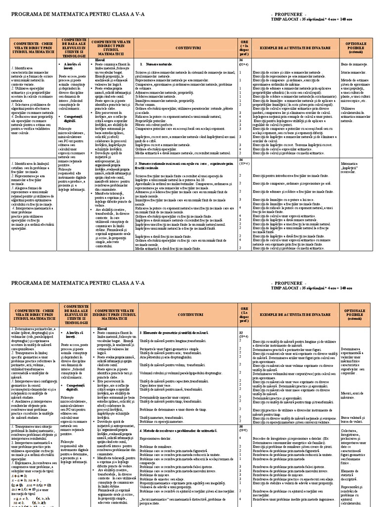 PROGRAMA DE MATEMATICA PENTRU CLASA A V-A