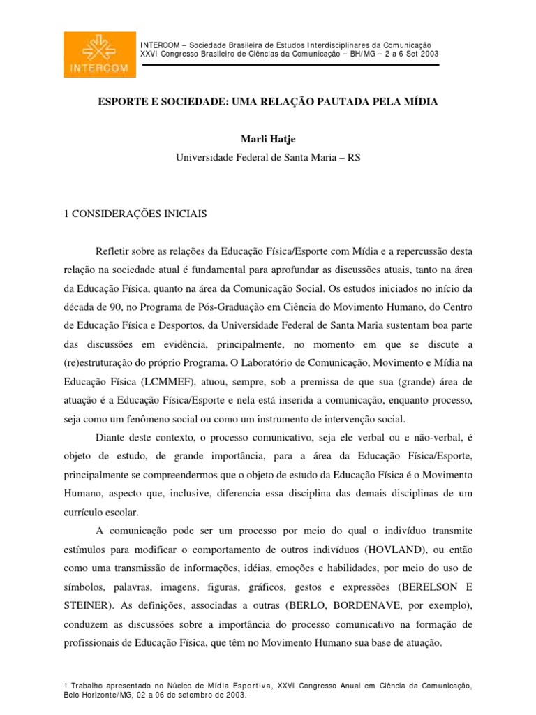 1 Trabalho apresentado no Núcleo de Mídia Esportiva, XXVI Congresso Anual em Ciência da Comunicação, Belo Horizonte/MG, 02 a 06 de setembro de 2003.