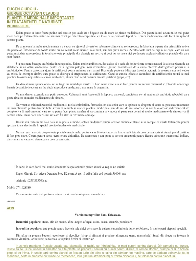 n cazul n care doriti mai multe amanunte despre anumite plante atunci va rog sa ne scrieti: Eugen Giurgiu Str. Aleea Detunata bloc D2 scara A ap. 19 Alba Iulia cod postal: 510064 sau telefonic :0258\833500sau Mobil: 0741928880 Va multumim anticipat pentru aceste scrisori care le asteptam cu nerabdare. Autorii AFIN Vaccinum myrtillus Fam. Ericaceae. Denumiri populare: afene, afin de munte, afine -negre, afinghi, asine, coaca, cucuzie, pomisoare n traditia populara: este pretuit pentru fructele sale dulci-acrisoare, la culesul carora n iunie-iulie, se folosesc n multe parti piepteni speciali. Din afine se prepara bauturi racoritoare si alcoolice (sirop si afinata) si produse alimentare (gem, marmelada) Sucul din fructe se folosea la colorarea vinurilor, iar n trecut se folosea la vopsitul firelor si tesaturilor. n zonele montane, fructele uscate sau plamadite n rachiu se ntrebuintau n mod curent contra diareei. Din ramurile cu frunze, lasate sa se usuce, uneori n amestec cu alte plante, se preparau ceaiuri nu numai pentru diaree, dureri de stomac, crampe ci si n boli de piept si de inima. n unele parti contra diareei se faceau turte din afine si faina din smburi de masline, care se dadeau bolnavului sa le mannce, fierte n amestec cu frunze de mesteacan, laur (Datura stramonium) si traista ciobanului, se foloseau contra diabetului. Compozitie chimica: frunzele contin arbutina, tanin, derivati flavonici, derivati antocianici, hidrochinona, mirtilina, ericolina, neomirtilina, etc; fructele- tanin, pectine, mirtilina, zaharuri, provitamina A, vitamina B1, B2, C, E, PP, acizi: citric, benzoic, malic, oxalic, tartric, succinic, malic, lactic, principii bacteriostatice.. Actiune farmaceutica; au proprietati astringente n fructe exista si proprietati antibiotice, antiseptice, bacteriostatice, scade zaharul din snge, antidiareic, diuretic, antiseptic urinar, creste acuitatea vizuala, adjuvant al diabetului. Fructele antidiareice, antiseptic intestinal, antihelintic, creste acuitatea vizuala, antiseptic urinar, adjuvant n tratarea diabetului. Se poate folosi la urmatoarele afectiuni: frunzele-diabet, afectiuni buco-faringiene, afectiuni coronariene, afte, ateroscleroza, balonari, candidoze, cistite, diaree, enterita, guta, infectii urinare, reumatism.