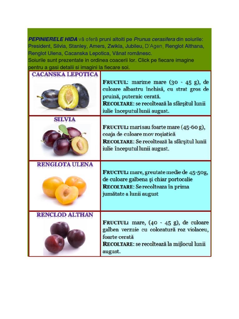 DAgen, Renglot Althana, Renglot Ulena, Cacanska Lepotica, Vnat romnesc. Soiurile sunt prezentate in ordinea coacerii lor. Click pe fiecare imagine pentru a gasi detalii si imagini la fiecare soi.