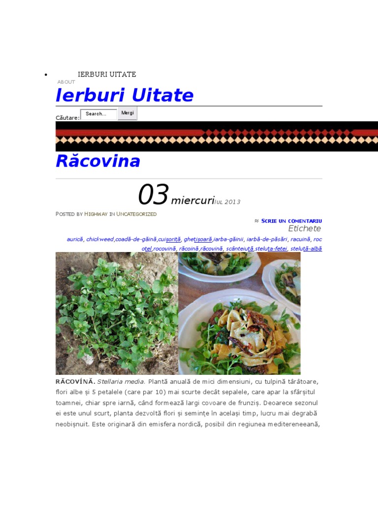 RCOVN. Stellaria media. Plant anual de mici dimensiuni, cu tulpin trtoare, flori albe i 5 petalele (care par 10) mai scurte dect sepalele, care apar la sfritul toamnei, chiar spre iarn, cnd formeaz largi covoare de frunzi. Deoarece sezonul ei este unul scurt, planta dezvolt flori i semine n acelai timp, lucru mai degrab neobinuit. Este originar din emisfera nordic, posibil din regiunea meditereneean,