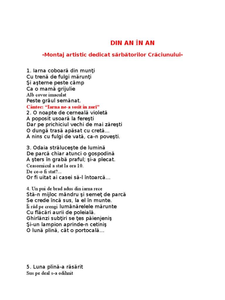 -Montaj artistic dedicat srbtorilor Crciunului1. Iarna coboar din muni Cu tren de fulgi mruni i aterne peste cmp Ca o mam grijulie Alb covor imaculat Peste grul semnat. Cntec: Iarna ne-a sosit n zori 2. O noapte de cerneal violet A poposit usoar la fereti Dar pe prichiciul vechi de mai zreti O dung tras apsat cu cret... A nins cu fulgi de vat, ca-n poveti. 3. Odaia strlucete de lumin De parc chiar atunci o gospodin A ters n grab praful; i-a plecat. Ceasornicul a stat la ora 10. De ce-o fi stat?... Or fi uitat ai casei s-l ntoarc 4. Un pui de brad adus din iarna rece St-n mijloc mndru i seme de parc Se crede nc sus, la el n munte. i rd pe crengi lumnrelele mrunte Cu flcri aurii de poleial. Ghirlnzi subiri se es pienjeni i-un lampion aprinde-n cetini O lun plin, ct o portocal