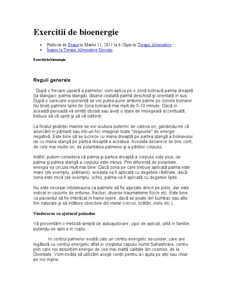 Exercitii bioenergie Inchidei ochii, v relaxai uor respirand lent dar ritmic, pan simii c suntei cuprini de o stare de bine. Apropiai-v palmele deschise in faa corpului, la nivelul ombilicului (cu ochii inchii), i incercai s simii energia care curge din centrul palmei drepte spre centrul palmei stangi. Apropiai i deprtai palmele, la inceput intre 5 i 20 cm, iar apoi pe distane din ce in ce mai mari, pe msur ce vei avansa. Dup ce va trece o perioad de timp de exersare, palmele dumneavoastr vor deveni mai sensibile. Din cand in cand este util s ne frecm palmele pan cand vor deveni calde (activand astfel centrii din palme i centrul din cretetul capului), iar apoi trecand din nou la exersare. Dup ce ai inceput s simii cldur, furnicturi sau inepturi (senzaiile difer de la om la om) continuai acest exerciiu, dar cu ochii deschii. Mai tarziu vei observa c incepei s percepei aceste senzaii foarte uor i cu ochii deschii. Putei trece acum la palparea energetic a antebraului, a zonei din jurul capului, a genunchilor, a intregului dumneavoastr corp. La inceput vei plimba palma la o distan de 10 20 cm de oricare zon pe care o palpai energetic, dup mai mult antrenament reuind s mrii aceast distan pan la un metru sau chiar mai mult. Nu trebuie s insistai prea mult chiar de la inceput, nu forai percepia, incercai mereu s rmanei relaxai, fiind doar ateni la ce se intamp sub palmele dumneavoastr.