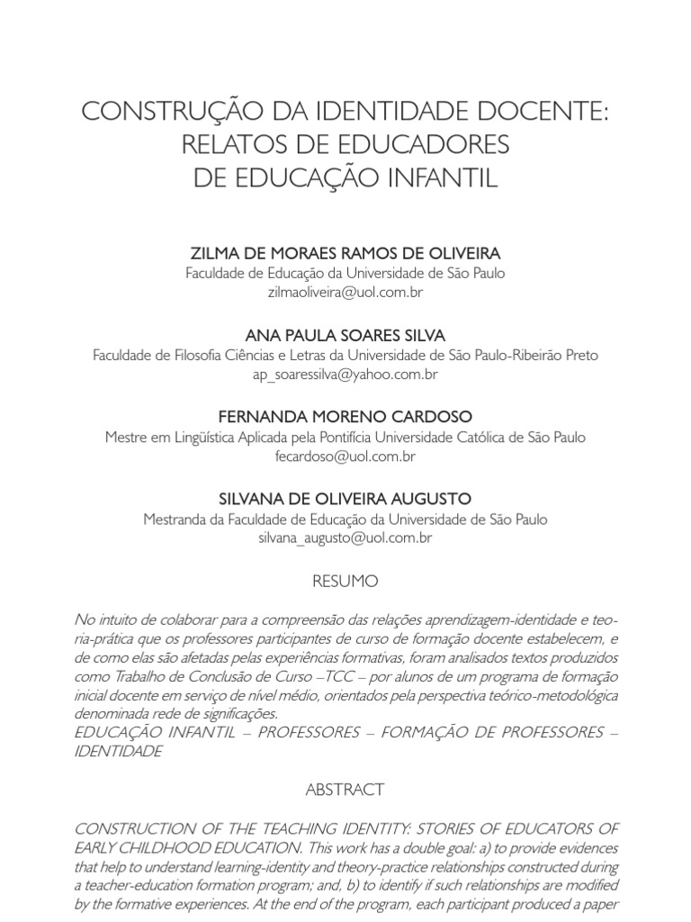 in a self-narrative form, that was analyzed through a theoretic-methodological perspective that is known as Network of Meanings. EARLY CHILDHOOD EDUCATION – TEACHERS – TEACHER EDUCATION – IDENTITY