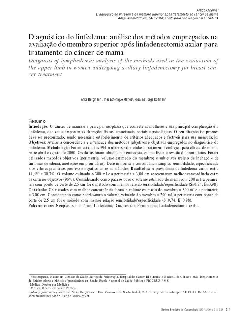 Resumo Introduo: O cncer de mama a principal neoplasia que acomete as mulheres e sua principal complicao o linfedema, que causa importantes alteraes fsicas, emocionais, sociais e psicolgicas. O seu diagnstico precoce deve ser preconizado, sendo necessrio estabelecimento de critrios adequados e factveis para sua mensurao. Objetivos: Avaliar a concordncia e a validade dos mtodos subjetivos e objetivos empregados no diagnstico do linfedema. Metodologia: Foram estudadas 394 mulheres submetidas a tratamento cirrgico para cncer de mama, entre abril e agosto de 2000. Os dados foram obtidos por entrevista, exame fsico e reviso de pronturios. Foram utilizados mtodos objetivos (perimetria, volume estimado do membro) e subjetivos (relato de inchao e de sintomas de edema, anotaes em pronturio). Determinou-se a concordncia simples, sensibilidade, especificidade e os valores preditivos positivo e negativo entre os mtodos. Resultados: A prevalncia de linfedema variou entre 11,5% e 30,7%. O volume estimado > 300 ml e a perimetria > 3,00 cm apresentaram melhor concordncia entre os critrios objetivos (96%). Considerando como padro-ouro o volume estimado do membro = 200 ml, a perimetria com ponto de corte de 2,5 cm foi o mtodo com melhor relao sensibilidade/especificidade (S=0,74; E=0,98). Concluso: Os mtodos com melhor concordncia foram o volume estimado do membro = 300 ml e a perimetria = 3,00 cm. Considerando como padro-ouro o volume estimado do membro = 200 ml, a perimetria com ponto de corte de 2,5 cm foi o mtodo com melhor relao sensibilidade/especificidade (S=0,74; E=0,98). Palavras-chave: Neoplasias mamrias; Linfedema; Diagnstico; Fisioterapia; Linfadenectomia axilar.
