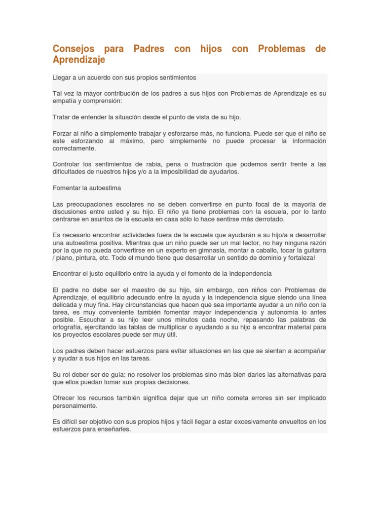 Llegar a un acuerdo con sus propios sentimientos Tal vez la mayor contribucin de los padres a sus hijos con Problemas de Aprendizaje es su empata y comprensin: Tratar de entender la situacin desde el punto de vista de su hijo. Forzar al nio a simplemente trabajar y esforzarse ms, no funciona. Puede ser que el nio se este esforzando al mximo, pero simplemente no puede procesar la informacin correctamente. Controlar los sentimientos de rabia, pena o frustracin que podemos sentir frente a las dificultades de nuestros hijos y/o a la imposibilidad de ayudarlos. Fomentar la autoestima Las preocupaciones escolares no se deben convertirse en punto focal de la mayora de discusiones entre usted y su hijo. El nio ya tiene problemas con la escuela, por lo tanto centrarse en asuntos de la escuela en casa slo lo hace sentirse ms derrotado. Es necesario encontrar actividades fuera de la escuela que ayudarn a su hijo/a a desarrollar una autoestima positiva. Mientras que un nio puede ser un mal lector, no hay ninguna razn por la que no pueda convertirse en un experto en gimnasia, montar a caballo, tocar la guitarra / piano, pintura, etc. Todo el mundo tiene que desarrollar un sentido de dominio y fortaleza! Encontrar el justo equilibrio entre la ayuda y el fomento de la Independencia El padre no debe ser el maestro de su hijo, sin embargo, con nios con Problemas de Aprendizaje, el equilibrio adecuado entre la ayuda y la independencia sigue siendo una lnea delicada y muy fina. Hay circunstancias que hacen que sea importante ayudar a un nio con la tarea, es muy conveniente tambin fomentar mayor independencia y autonoma lo antes posible. Escuchar a su hijo leer unos minutos cada noche, repasando las palabras de ortografa, ejercitando las tablas de multiplicar o ayudando a su hijo a encontrar material para los proyectos escolares puede ser muy til. Los padres deben hacer esfuerzos para evitar situaciones en las que se sientan a acompaar y ayudar a sus hijos en las tareas. Su rol deber ser de gua: no resolver los problemas sino ms bien darles las alternativas para que ellos puedan tomar sus propias decisiones. Ofrecer los recursos tambin significa dejar que un nio cometa errores sin ser implicado personalmente. Es difcil ser objetivo con sus propios hijos y fcil llegar a estar excesivamente envueltos en los esfuerzos para ensearles.