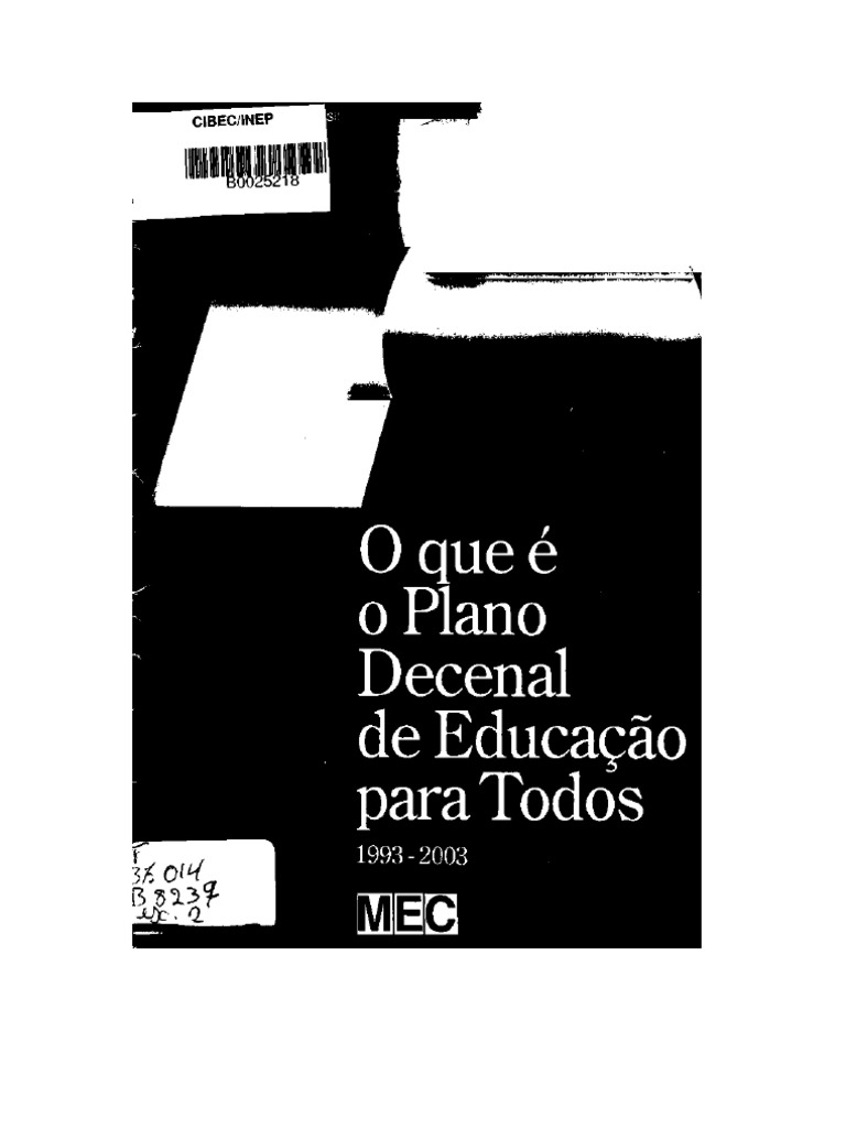 Brasil. Ministrio da Educao e do Desporto. Secretaria de Educao Fundamental. O que o Plano Decenal de Educao para todos/ MEC/SEF. - Braslia: MEC/SEF, 1993. 8 p. 1. Planejamento da Educao. 2. Poltica da Educao. I. Ttulo. CDU: 37.014.542