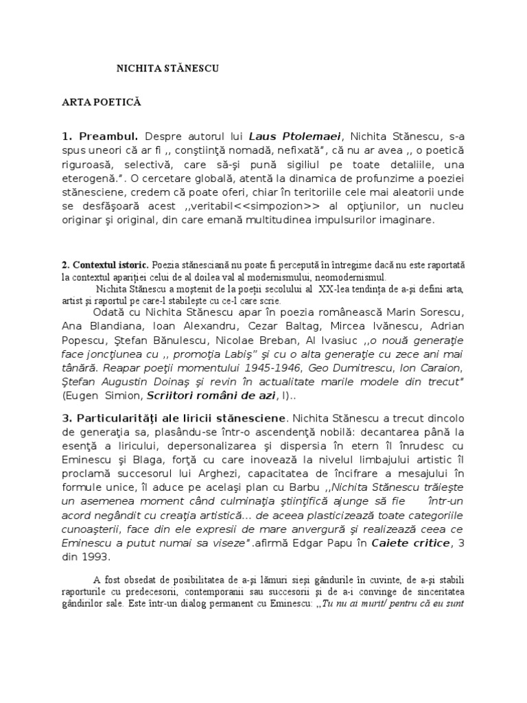 NICHITA STNESCU ARTA POETIC 1. Preambul.