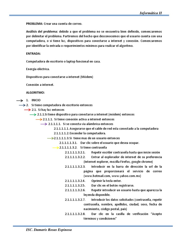 PROBLEMA: Crear una cuenta de correo. Anlisis del problema: debido a que el problema no se encuentra bien definido, comenzaremos por delimitar el problema. Partiremos del hecho que desconocemos que el usuario cuenta con una computadora, o si tiene luz, dispositivos para conectarse a internet y conexin. Comenzaremos por identificar la entrada o requerimientos mnimos para realizar el algoritmo. ENTRADA: Computadora de escritorio o laptop funcional en casa. Energa elctrica. Dispositivos para conectarse a internet (Mdem) Conexin a internet. ALGORITMO: 1. INICIO 2. Si tiene computadora de escritorio entonces 2.1. Si hay luz entonces 2.1.1.Si tiene dispositivo para conectarse a internet (mdem) entonces 2.1.1.1. Si tiene conexin activa a internet entonces 2.1.1.1.1. Si se conecta va almbrica entonces 2.1.1.1.1.1. Asegurarse que el cable de red esta conectado a la computadora 2.1.1.1.1.2. Encender la computadora. 2.1.1.1.1.3. Si tiene mas de un usuario entonces 2.1.1.1.1.3.1. Dar clic sobre el usuario que desea ocupar. 2.1.1.1.1.3.2. Si tiene contrasea 2.1.1.1.1.3.2.1. Repetir escribir contrasea hasta que inicie sesin 2.1.1.1.1.3.2.2. Entrar al explorador de internet de su preferencia (Internet explorer, mozilla Firefox, google chrome) 2.1.1.1.1.3.2.3. Introducir en la barra de direccin la url de la pgina que proporcionar el servicio de correo (www.hotmail.com, www.yahoo.com.mx) 2.1.1.1.1.3.2.4. Oprimir la tecla enter. 2.1.1.1.1.3.2.5. Dar clic en el botn registrarse. 2.1.1.1.1.3.2.6. Repetir introducir un usuario hasta que aparezca la leyenda disponible. 2.1.1.1.1.3.2.7. Introducir los datos solicitados (contrasea, repetir contrasea, nombre, apellidos, ciudad, sexo, fecha de nacimiento, cdigo postal, pas) 2.1.1.1.1.3.2.8. Dar clic en la casilla de verificacin Acepto trminos y condiciones