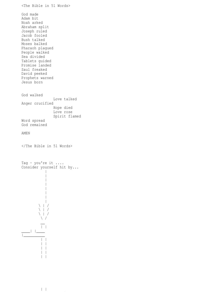 Bush talked Moses balked Pharaoh plagued People walked Sea divided Tablets guided Promise landed Saul freaked David peeked Prophets warned Jesus born God walked Love talked Anger crucified Hope died Love rose Spirit flamed Word spread God remained AMEN </The Bible in 51 Words>