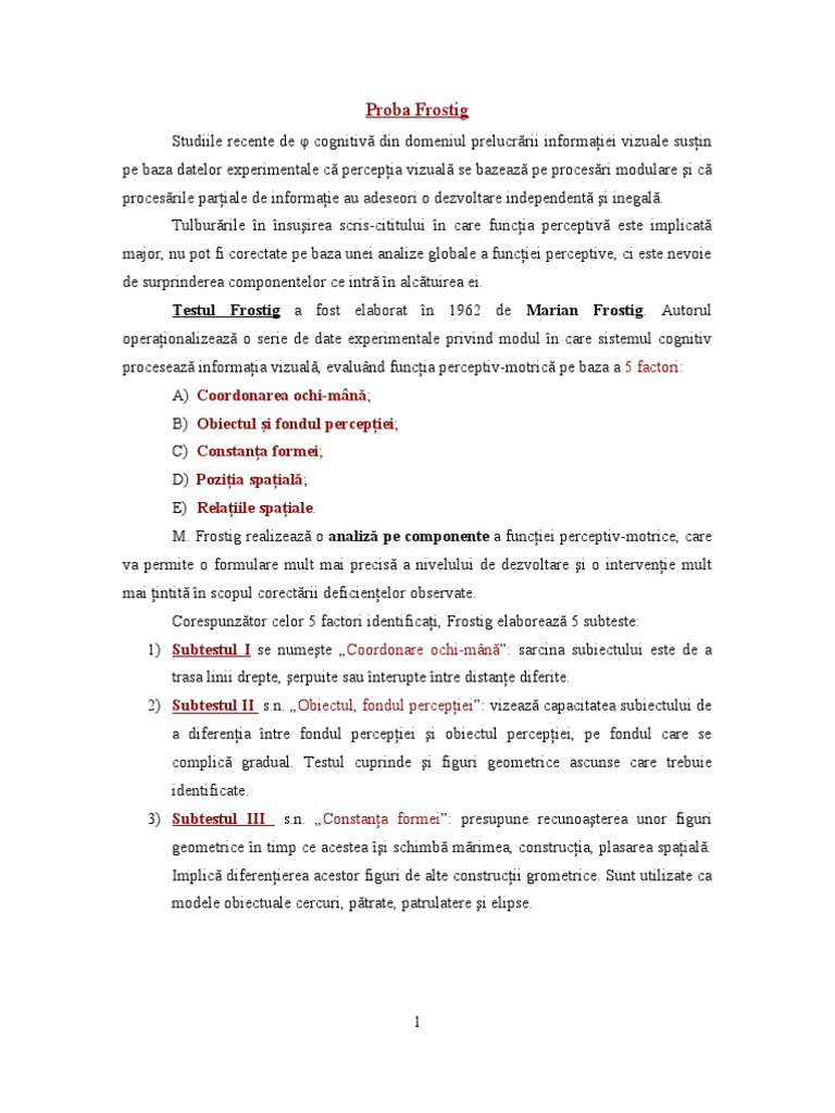 Studiile recente de cognitiv din domeniul prelucrrii informaiei vizuale susin pe baza datelor experimentale c percepia vizual se bazeaz pe procesri modulare i c procesrile pariale de informaie au adeseori o dezvoltare independent i inegal. Tulburrile n nsuirea scris-cititului n care funcia perceptiv este implicat major, nu pot fi corectate pe baza unei analize globale a funciei perceptive, ci este nevoie de surprinderea componentelor ce intr n alctuirea ei. Testul Frostig a fost elaborat n 1962 de Marian Frostig. Autorul operaionalizeaz o serie de date experimentale privind modul n care sistemul cognitiv proceseaz informaia vizual, evalund funcia perceptiv-motric pe baza a 5 factori: A) Coordonarea ochi-mn; B) Obiectul i fondul percepiei; C) Constana formei; D) Poziia spaial; E) Relaiile spaiale. M. Frostig realizeaz o analiz pe componente a funciei perceptiv-motrice, care va permite o formulare mult mai precis a nivelului de dezvoltare i o intervenie mult mai intit n scopul corectrii deficienelor observate. Corespunztor celor 5 factori identificai, Frostig elaboreaz 5 subteste: 1) Subtestul I se numete Coordonare ochi-mn: sarcina subiectului este de a trasa linii drepte, erpuite sau nterupte ntre distane diferite. 2) Subtestul II s.n. Obiectul, fondul percepiei: vizeaz capacitatea subiectului de a diferenia ntre fondul percepiei i obiectul percepiei, pe fondul care se complic gradual. Testul cuprinde i figuri geometrice ascunse care trebuie identificate. 3) Subtestul III s.n. Constana formei: presupune recunoaterea unor figuri geometrice n timp ce acestea i schimb mrimea, construcia, plasarea spaial. Implic diferenierea acestor figuri de alte construcii grometrice. Sunt utilizate ca modele obiectuale cercuri, ptrate, patrulatere i elipse.