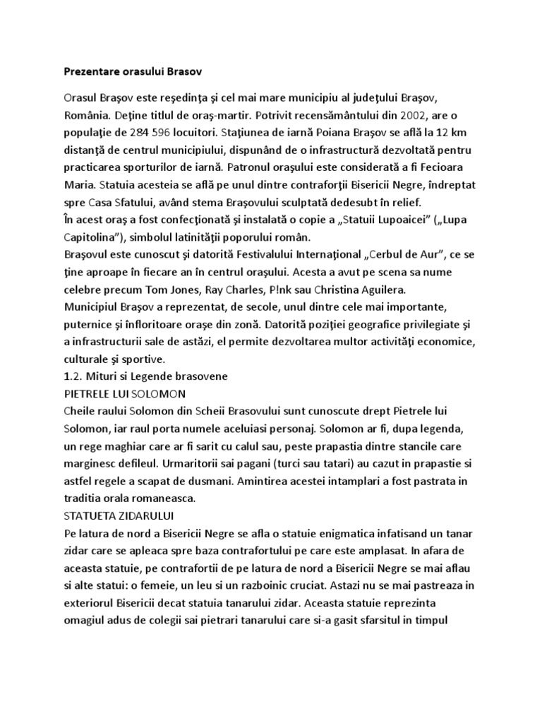 Deine titlul de ora-martir. Potrivit recensmntului din 2002, are o populaie de 284 596 locuitori. Staiunea de iarn Poiana Braov se afl la 12 km distan de centrul municipiului, dispunnd de o infrastructur dezvoltat pentru practicarea sporturilor de iarn. Patronul oraului este considerat a fi Fecioara Maria. Statuia acesteia se afl pe unul dintre contraforii Bisericii Negre, ndreptat spre Casa Sfatului, avnd stema Braovului sculptat dedesubt n relief. n acest ora a fost confecionat i instalat o copie a Statuii Lupoaicei (Lupa Capitolina), simbolul latinitii poporului romn. Braovul este cunoscut i datorit Festivalului Internaional Cerbul de Aur, ce se ine aproape n fiecare an n centrul oraului. Acesta a avut pe scena sa nume celebre precum Tom Jones, Ray Charles, P!nk sau Christina Aguilera. Municipiul Braov a reprezentat, de secole, unul dintre cele mai importante, puternice i nfloritoare orae din zon. Datorit poziiei geografice privilegiate i a infrastructurii sale de astzi, el permite dezvoltarea multor activiti economice, culturale i sportive. 1.2. Mituri si Legende brasovene PIETRELE LUI SOLOMON Cheile raului Solomon din Scheii Brasovului sunt cunoscute drept Pietrele lui Solomon, iar raul porta numele aceluiasi personaj. Solomon ar fi, dupa legenda, un rege maghiar care ar fi sarit cu calul sau, peste prapastia dintre stancile care marginesc defileul. Urmaritorii sai pagani (turci sau tatari) au cazut in prapastie si astfel regele a scapat de dusmani. Amintirea acestei intamplari a fost pastrata in traditia orala romaneasca. STATUETA ZIDARULUI Pe latura de nord a Bisericii Negre se afla o statuie enigmatica infatisand un tanar zidar care se apleaca spre baza contrafortului pe care este amplasat. In afara de aceasta statuie, pe contrafortii de pe latura de nord a Bisericii Negre se mai aflau si alte statui: o femeie, un leu si un razboinic cruciat. Astazi nu se mai pastreaza in exteriorul Bisericii decat statuia tanarului zidar. Aceasta statuie reprezinta omagiul adus de colegii sai pietrari tanarului care si-a gasit sfarsitul in timpul