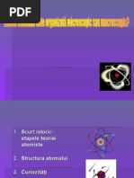 de electroni al atomului. Numrul electronilor dintr-un atom este egal cu numrul protonilor din nucleu. simbol: e-; masa: 9,1 x 10-31 kg; sarcina electric: -1 nveliul electronic are o structur stratificat. El este format din straturi concentrice nucleului, notate cu numere ntregi i pozitive, de la 1 la 7, sau cu urmtoarele litere: K,L,M,N,O,P,Q. Pentru msurarea dimensiunilor foarte mici ale atomilor se folosete unitatea de msura numit Angstrm (). 1 = 10-1m. Microscopul electronic, aparat care mrete de 15 milioane de ori, a permis fotografierea atomilor dintr-o foi de aur. Atomul de hidrogen este cel mai mic i cel mai simplu atom. tiai c? Chihlimbarul, denumit electron n limba greac, este rina de pin, utilizat pentru prima oara n experienele de electrizare prin frecare. Pentru numrarea atomilor coninui ntr-un milligram de hidrogen ar fi necesare 200 miliarde de secole, numrnd un atom pe secund. n gmlia unui ac, ntr-un volum de 1mm3 se afl 80 de miliarde de atomi de fier. 100 de milioane de atomi aranjai n lan nu au mai mult de 1 cm. Electronul se nvrte n jurul nucleului atomului cu 300000 km pe secund. Cu o astfel de vitez, electronul ar putea nconjura Pmntul de 8 ori ntr-o secund. Dac toate nucleele (n limba latin, nucleus nseamn smbure) din Univers ar putea fi adunate, el ar ncpea ntr-un capac al unei sticle de Coca-Cola. Volumul unui nucleu este de 1000 miliarde de ori mai mic dect volumul atomului din care provine. Nucleul n atom este ct o gmlie de chibrit pe un teren de fotbal.