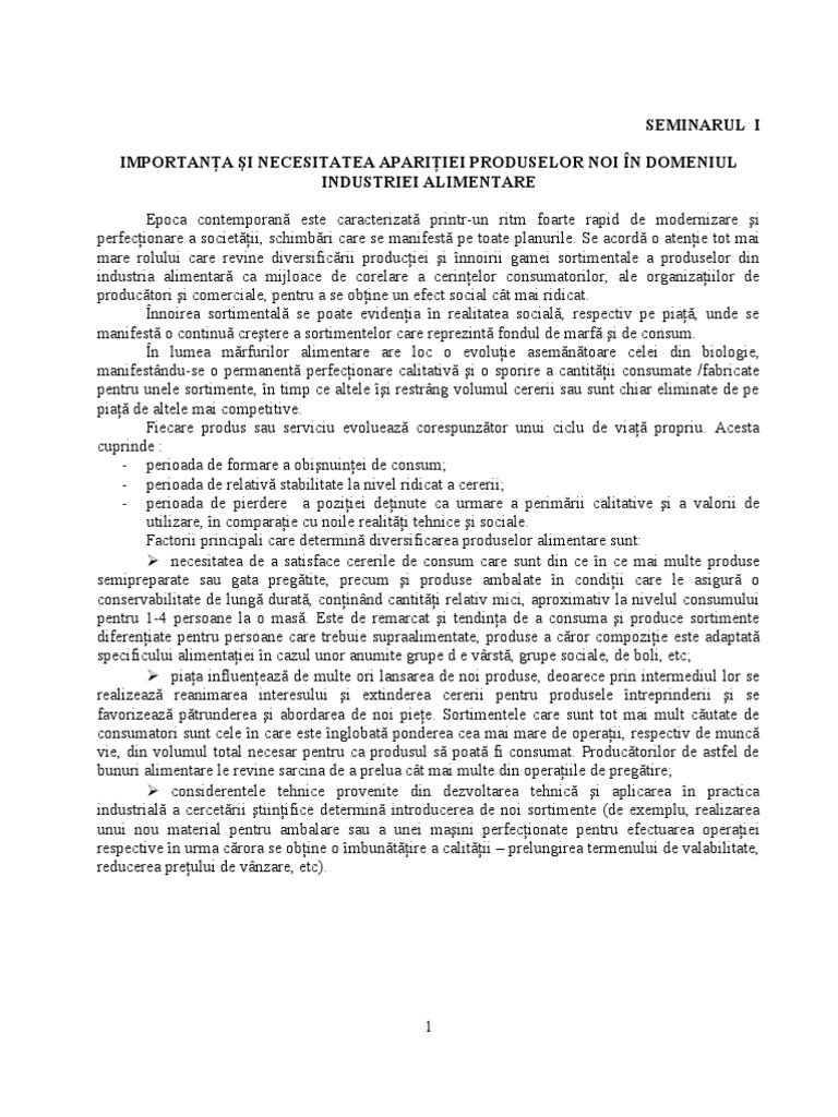 foarte rapid de modernizare i perfecionare a societii, schimbri care se manifest pe toate planurile. Se acord o atenie tot mai mare rolului care revine diversificrii produciei i nnoirii gamei sortimentale a produselor din industria alimentar ca mijloace de corelare a cerinelor consumatorilor, ale organizaiilor de productori i comerciale, pentru a se obine un efect social ct mai ridicat. nnoirea sortimental se poate evidenia n realitatea social, respectiv pe pia, unde se manifest o continu cretere a sortimentelor care reprezint fondul de marf i de consum. n lumea mrfurilor alimentare are loc o evoluie asemntoare celei din biologie, manifestndu-se o permanent perfecionare calitativ i o sporire a cantitii consumate /fabricate pentru unele sortimente, n timp ce altele i restrng volumul cererii sau sunt chiar eliminate de pe pia de altele mai competitive. Fiecare produs sau serviciu evolueaz corespunztor unui ciclu de via propriu. Acesta cuprinde : - perioada de formare a obinuinei de consum; - perioada de relativ stabilitate la nivel ridicat a cererii; - perioada de pierdere a poziiei deinute ca urmare a perimrii calitative i a valorii de utilizare, n comparaie cu noile realiti tehnice i sociale. Factorii principali care determin diversificarea produselor alimentare sunt: necesitatea de a satisface cererile de consum care sunt din ce n ce mai multe produse semipreparate sau gata pregtite, precum i produse ambalate n condiii care le asigur o conservabilitate de lung durat, coninnd cantiti relativ mici, aproximativ la nivelul consumului pentru 1-4 persoane la o mas. Este de remarcat i tendina de a consuma i produce sortimente difereniate pentru persoane care trebuie supraalimentate, produse a cror compoziie este adaptat specificului alimentaiei n cazul unor anumite grupe d e vrst, grupe sociale, de boli, etc; piaa influeneaz de multe ori lansarea de noi produse, deoarece prin intermediul lor se realizeaz reanimarea interesului i extinderea cererii pentru produsele ntreprinderii i se favorizeaz ptrunderea i abordarea de noi piee. Sortimentele care sunt tot mai mult cutate de consumatori sunt cele n care este nglobat ponderea cea mai mare de operaii, respectiv de munc vie, din volumul total necesar pentru ca produsul s poat fi consumat. Productorilor de astfel de bunuri alimentare le revine sarcina de a prelua ct mai multe din operaiile de pregtire; considerentele tehnice provenite din dezvoltarea tehnic i aplicarea n practica industrial a cercetrii tiinifice determin introducerea de noi sortimente (de exemplu, realizarea unui nou material pentru ambalare sau a unei maini perfecionate pentru efectuarea operaiei respective n urma crora se obine o mbuntire a calitii prelungirea termenului de valabilitate, reducerea preului de vnzare, etc).