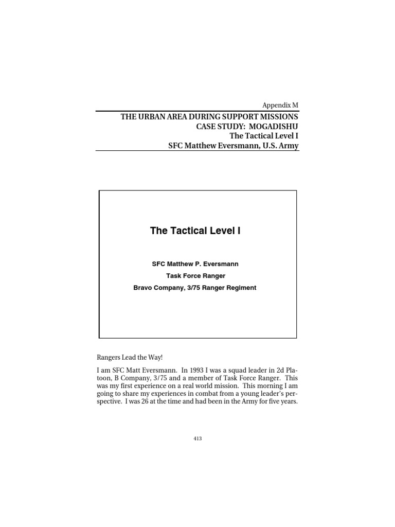 I am SFC Matt Eversmann. In 1993 I was a squad leader in 2d Pla- toon, B Company, 3/75 and a member of Task Force Ranger. This was my first experience on a real world mission. This morning I am going to share my experiences in combat from a young leader’s per- spective. I was 26 at the time and had been in the Army for five years.