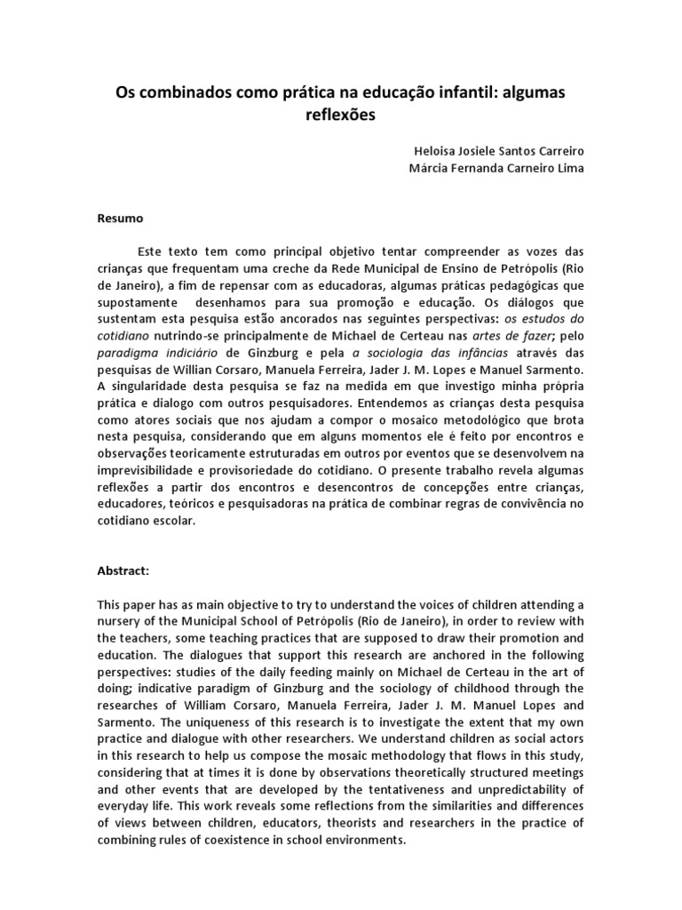 espaço educacional. A partir de conversas com outros profissionais da rede municipal de ensino de Petrópolis, pude constatar que esta é uma prática recorrente. Mesmo com variações em alguns procedimentos metodológicos de abordagem com as crianças, a prática pedagógica de “construção e manutenção de combinados” se faz presente em muitas rotinas. E de modo muito equivocado, pois há uma simulação de que as crianças são convidadas a falar e a combinar relações. As crianças são de fato convocadas a uma atitude de aceitação de regras de convivência impostas pelos educadores, que parecem partir do pressuposto de que elas não têm competência e a maturidade necessária para coletivamente pensar os elementos necessários para a orientação da convivência no espaço escolar.