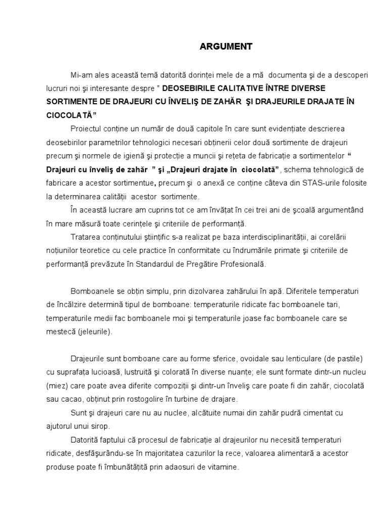 Mi-am ales aceast tem datorit dorinei mele de a m documenta i de a descoperi lucruri noi i interesante despre " DEOSEBIRILE CALITATIVE NTRE DIVERSE SORTIMENTE DE DRAJEURI CU NVELI DE ZAHR I DRAJEURILE DRAJATE N CIOCOLAT Proiectul conine un numr de dou capitole n care sunt evideniate descrierea deosebirilor parametrilor tehnologici necesari obinerii celor dou sortimente de drajeuri precum i normele de igien i protecie a muncii i reeta de fabricaie a sortimentelor Drajeuri cu nveli de zahr i Drajeuri drajate n ciocolat , schema tehnologic de fabricare a acestor sortimentue, precum i o anex ce conine cteva din STAS-urile folosite la determinarea calitii acestor sortimente. n aceast lucrare am cuprins tot ce am nvat n cei trei ani de coal argumentnd n mare msur toate cerinele i criteriile de performan. Tratarea coninutului tiinific s-a realizat pe baza interdisciplinaritii, ai corelrii noiunilor teoretice cu cele practice n conformitate cu ndrumrile primate i criteriile de performan prevzute n Standardul de Pregtire Profesional. Bomboanele se obin simplu, prin dizolvarea zahrului n ap. Diferitele temperaturi de nclzire determin tipul de bomboane: temperaturile ridicate fac bomboanele tari, temperaturile medii fac bomboanele moi i temperaturile joase fac bomboanele care se mestec (jeleurile). Drajeurile sunt bomboane care au forme sferice, ovoidale sau lenticulare (de pastile) cu suprafaa lucioas, lustruit i colorat n diverse nuane; ele sunt formate dintr-un nucleu (miez) care poate avea diferite compoziii i dintr-un nveli care poate fi din zahr, ciocolat sau cacao, obinut prin rostogolire n turbine de drajare. Sunt i drajeuri care nu au nuclee, aIctuite numai din zahr pudr cimentat cu ajutorul unui sirop. Datorit faptului c procesul de fabricaie al drajeurilor nu necesit temperaturi ridicate, desfurndu-se n majoritatea cazurilor la rece, valoarea alimentar a acestor produse poate fi mbuntit prin adaosuri de vitamine.