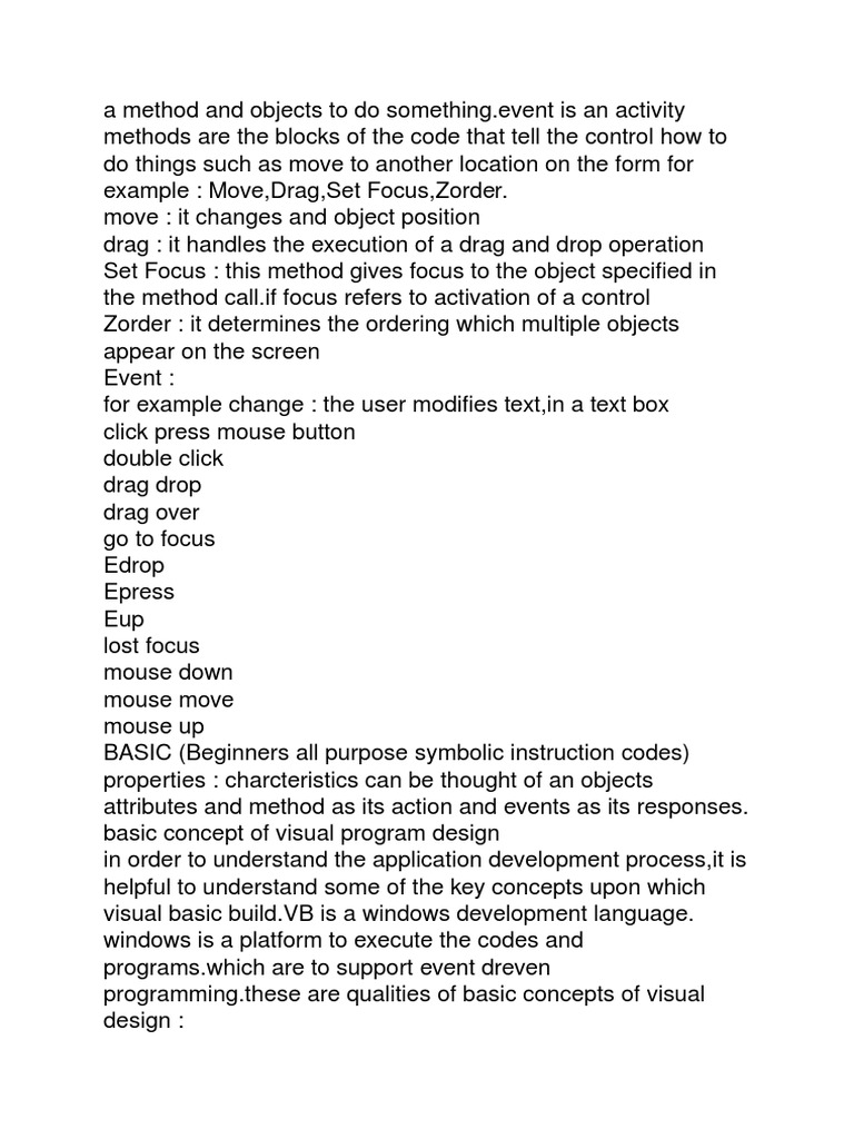 event is an activity methods are the blocks of the code that tell the control how to do things such as move to another location on the form for example : Move,Drag,Set Focus,Zorder. move : it changes and object position drag : it handles the execution of a drag and drop operation Set Focus : this method gives focus to the object specified in the method call.if focus refers to activation of a control Zorder : it determines the ordering which multiple objects appear on the screen Event : for example change : the user modifies text,in a text box click press mouse button double click drag drop drag over go to focus Edrop Epress Eup lost focus mouse down mouse move mouse up BASIC (Beginners all purpose symbolic instruction codes) properties : charcteristics can be thought of an objects attributes and method as its action and events as its responses. basic concept of visual program design in order to understand the application development process,it is helpful to understand some of the key concepts upon which visual basic build.VB is a windows development language. windows is a platform to execute the codes and programs.which are to support event dreven programming.these are qualities of basic concepts of visual design :