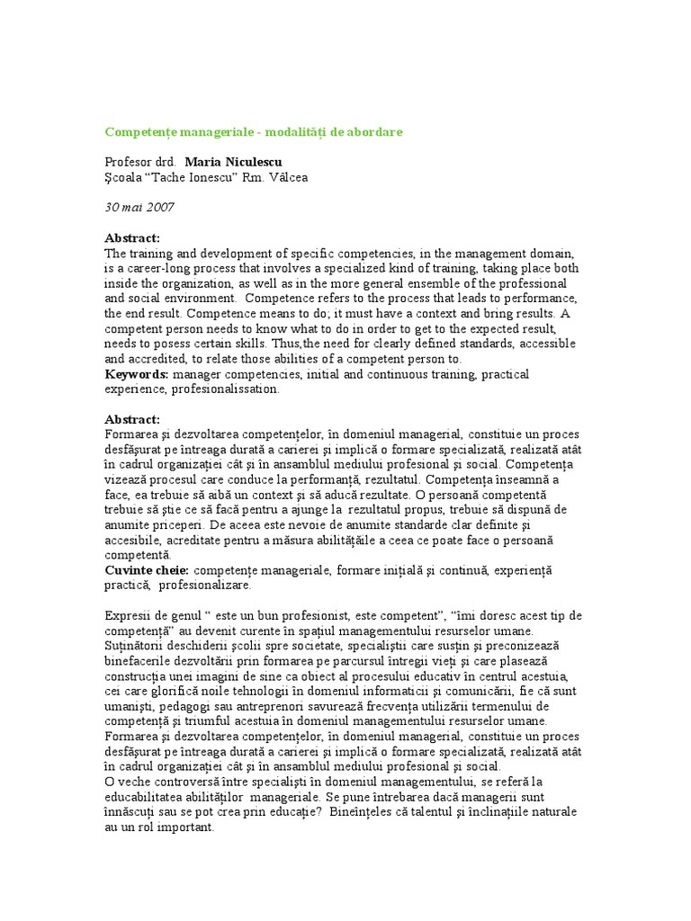 Vlcea 30 mai 2007 Abstract: The training and development of specific competencies, in the management domain, is a career-long process that involves a specialized kind of training, taking place both inside the organization, as well as in the more general ensemble of the professional and social environment. Competence refers to the process that leads to performance, the end result. Competence means to do; it must have a context and bring results. A competent person needs to know what to do in order to get to the expected result, needs to posess certain skills. Thus,the need for clearly defined standards, accessible and accredited, to relate those abilities of a competent person to. Keywords: manager competencies, initial and continuous training, practical experience, profesionalissation. Abstract: Formarea i dezvoltarea competenelor, n domeniul managerial, constituie un proces desfurat pe ntreaga durat a carierei i implic o formare specializat, realizat att n cadrul organizaiei ct i n ansamblul mediului profesional i social. Competena vizeaz procesul care conduce la performan, rezultatul. Competena nseamn a face, ea trebuie s aib un context i s aduc rezultate. O persoan competent trebuie s tie ce s fac pentru a ajunge la rezultatul propus, trebuie s dispun de anumite priceperi. De aceea este nevoie de anumite standarde clar definite i accesibile, acreditate pentru a msura abilitile a ceea ce poate face o persoan competent. Cuvinte cheie: competene manageriale, formare iniial i continu, experien practic, profesionalizare. Expresii de genul este un bun profesionist, este competent, mi doresc acest tip de competen au devenit curente n spaiul managementului resurselor umane. Suintorii deschiderii colii spre societate, specialitii care susin i preconizeaz binefacerile dezvoltrii prin formarea pe parcursul ntregii viei i care plaseaz construcia unei imagini de sine ca obiect al procesului educativ n centrul acestuia, cei care glorific noile tehnologii n domeniul informaticii i comunicrii, fie c sunt umaniti, pedagogi sau antreprenori savureaz frecvena utilizrii termenului de competen i triumful acestuia n domeniul managementului resurselor umane. Formarea i dezvoltarea competenelor, n domeniul managerial, constituie un proces desfurat pe ntreaga durat a carierei i implic o formare specializat, realizat att n cadrul organizaiei ct i n ansamblul mediului profesional i social. O veche controvers ntre specialiti n domeniul managementului, se refer la educabilitatea abilitilor manageriale. Se pune ntrebarea dac managerii sunt nnscui sau se pot crea prin educaie? Bineneles c talentul i nclinaiile naturale au un rol important.
