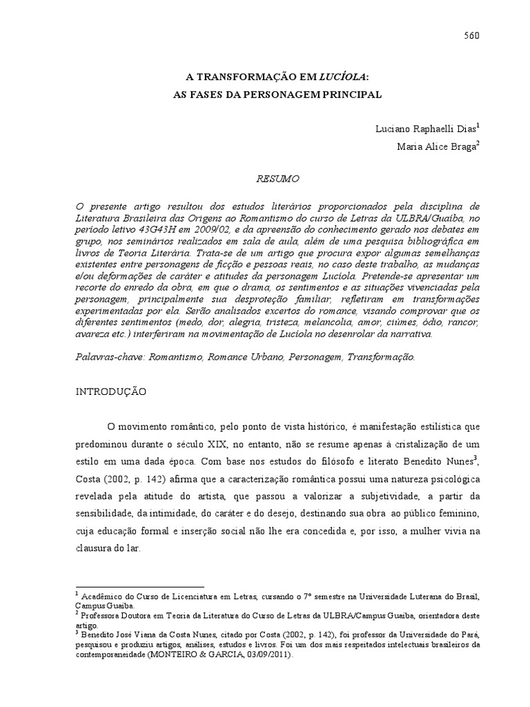 A TRANSFORMAO EM LUCOLA: AS FASES DA PERSONAGEM PRINCIPAL Luciano Raphaelli Dias1 Maria Alice Braga2 RESUMO O presente artigo resultou dos estudos literrios proporcionados pela disciplina de Literatura Brasileira das Origens ao Romantismo do curso de Letras da ULBRA/Guaba, no perodo letivo 43G43H em 2009/02, e da apreenso do conhecimento gerado nos debates em grupo, nos seminrios realizados em sala de aula, alm de uma pesquisa bibliogrfica em livros de Teoria Literria. Trata-se de um artigo que procura expor algumas semelhanas existentes entre personagens de fico e pessoas reais, no caso deste trabalho, as mudanas e/ou deformaes de carter e atitudes da personagem Lucola. Pretende-se apresentar um recorte do enredo da obra, em que o drama, os sentimentos e as situaes vivenciadas pela personagem, principalmente sua desproteo familiar, refletiram em transformaes experimentadas por ela. Sero analisados excertos do romance, visando comprovar que os diferentes sentimentos (medo, dor, alegria, tristeza, melancolia, amor, cimes, dio, rancor, avareza etc.) interferiram na movimentao de Lucola no desenrolar da narrativa. Palavras-chave: Romantismo, Romance Urbano, Personagem, Transformao.