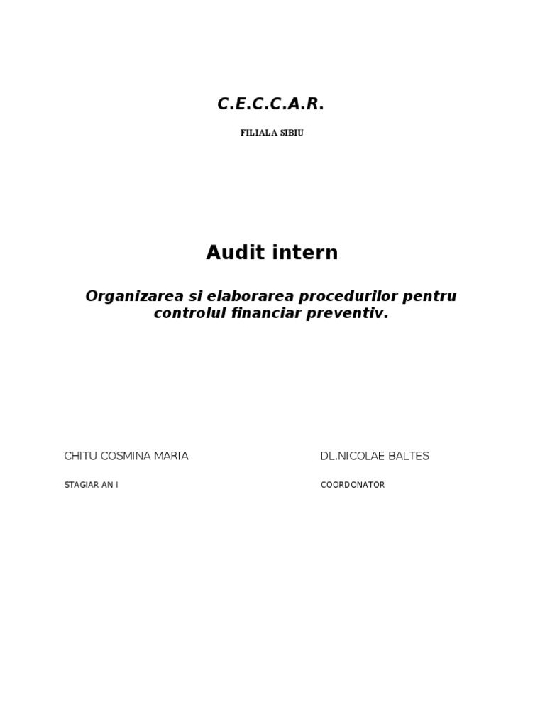 Organizarea si elaborarea procedurilor pentru controlul financiar preventiv.