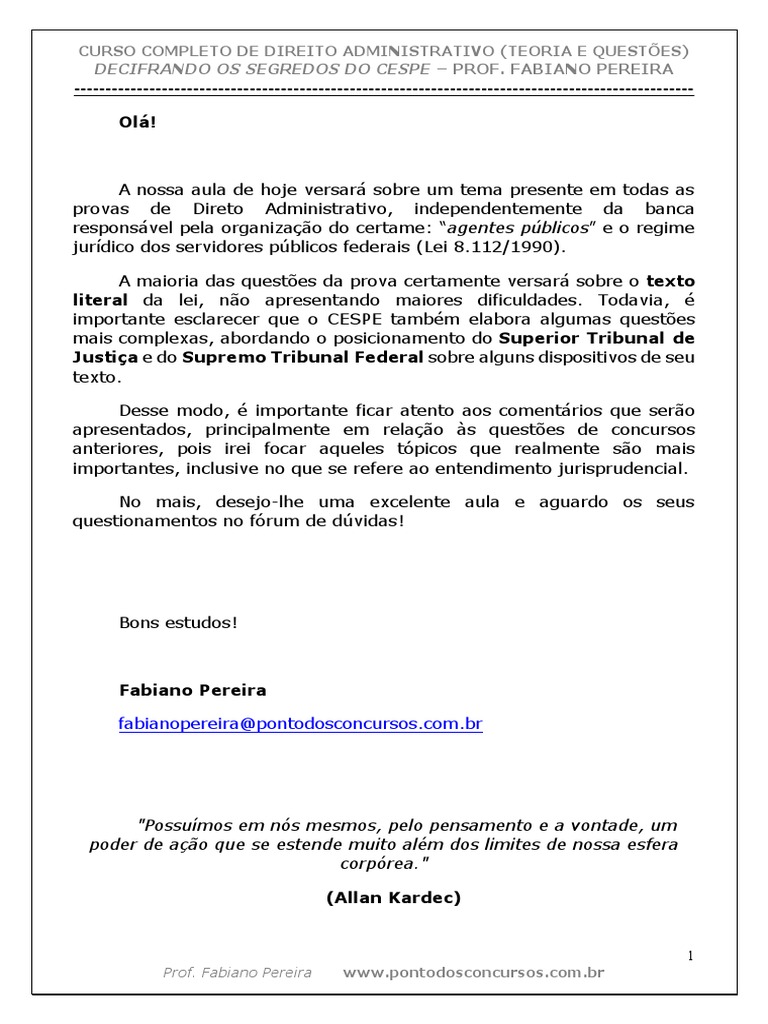 CURSO COMPLETO DE DIREITO ADMINISTRATIVO (TEORIA E QUESTES) DECIFRANDO OS SEGREDOS DO CESPE PROF. FABIANO PEREIRA --------------------------------------------------------------------------------------------------AGENTES PBLICOS. LEI 8.112/1990 E SUAS RESPECTIVAS ALTERAES