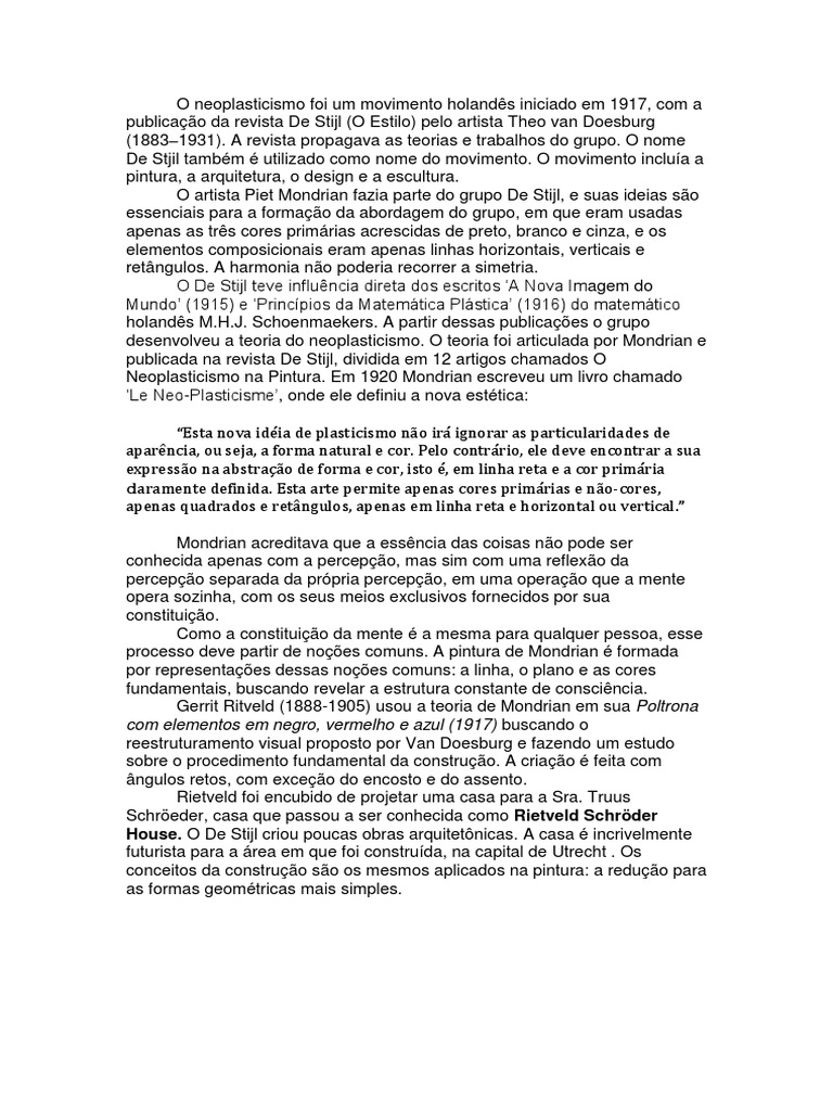 Doesburg (18831931). A revista propagava as teorias e trabalhos do grupo. O nome De Stjil tambm utilizado como nome do movimento. O movimento inclua a pintura, a arquitetura, o design e a escultura. O artista Piet Mondrian fazia parte do grupo De Stijl, e suas ideias so essenciais para a formao da abordagem do grupo, em que eram usadas apenas as trs cores primrias acrescidas de preto, branco e cinza, e os elementos composicionais eram apenas linhas horizontais, verticais e retngulos. A harmonia no poderia recorrer a simetria. O De Stijl teve influncia direta dos escritos A Nova Imagem do Mundo (1915) e Princpios da Matemtica Plstica (1916) do matemtico holands M.H.J. Schoenmaekers. A partir dessas publicaes o grupo desenvolveu a teoria do neoplasticismo. O teoria foi articulada por Mondrian e publicada na revista De Stijl, dividida em 12 artigos chamados O Neoplasticismo na Pintura. Em 1920 Mondrian escreveu um livro chamado Le Neo-Plasticisme, onde ele definiu a nova esttica: Esta nova idia de plasticismo no ir ignorar as particularidades de aparncia, ou seja, a forma natural e cor. Pelo contrrio, ele deve encontrar a sua expresso na abstrao de forma e cor, isto , em linha reta e a cor primria claramente definida. Esta arte permite apenas cores primrias e no-cores, apenas quadrados e retngulos, apenas em linha reta e horizontal ou vertical. Mondrian acreditava que a essncia das coisas no pode ser conhecida apenas com a percepo, mas sim com uma reflexo da percepo separada da prpria percepo, em uma operao que a mente opera sozinha, com os seus meios exclusivos fornecidos por sua constituio. Como a constituio da mente a mesma para qualquer pessoa, esse processo deve partir de noes comuns. A pintura de Mondrian formada por representaes dessas noes comuns: a linha, o plano e as cores fundamentais, buscando revelar a estrutura constante de conscincia. Gerrit Ritveld (1888-1905) usou a teoria de Mondrian em sua Poltrona com elementos em negro, vermelho e azul (1917) buscando o reestruturamento visual proposto por Van Doesburg e fazendo um estudo sobre o procedimento fundamental da construo. A criao feita com ngulos retos, com exceo do encosto e do assento. Rietveld foi encubido de projetar uma casa para a Sra. Truus Schreder, casa que passou a ser conhecida como Rietveld Schrder House. O De Stijl criou poucas obras arquitetnicas. A casa incrivelmente futurista para a rea em que foi construda, na capital de Utrecht . Os conceitos da construo so os mesmos aplicados na pintura: a reduo para as formas geomtricas mais simples.