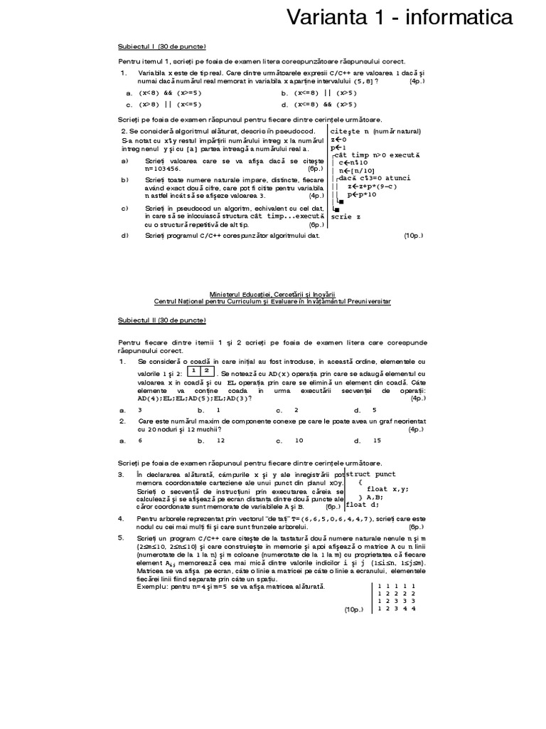 Toate subiectele sunt obligatorii. Se acord 10 puncte din oficiu. Timpul efectiv de lucru este de 3 ore. n rezolv rile cerute, identificatorii utiliza i trebuie s respecte preciz rile din enun (bold), iar n lipsa unor preciz ri explicite, nota iile trebuie s corespund cu semnifica iile asociate acestora (eventual n form prescurtat ). Subiectul I (30 de puncte) - Varianta 094 Pentru itemul 1, scrie i pe foaia de examen litera corespunz toare r spunsului corect. y=1; 1. n secven a al turat de instruc iuni, variabilele i,j,k i if (k>0) y sunt de tip ntreg. Pentru care dintre urm toarele if (i!=j) seturi de valori ale variabilelor i,j i k variabila y va y=0; avea valoarea 1 n urma execut rii secven ei? (4p.) else y=2; b. k=10; i=5; j=6 a. k=0; i=5; j=5 c. k=10; i=5; j=5 d. y nu va avea valoarea 1 indiferent de valorile variabilelor i,j i k Scrie i pe foaia de examen r spunsul pentru fiecare dintre cerin ele urm toare. cite te n 2. Se consider algoritmul al turat, descris n (num r natural nenul) pseudocod. n1 0 S-a notat cu x%y restul mp r irii num rului natural x la n2 0 num rul natural nenul y, iar cu [x/y] ctul mp r irii ntregi k1 0 a num rului natural x la num rul natural nenul y. ct timp n 0 execut dac (n%10)%2=0 atunci a) Scrie i ce va afi a algoritmul dac pentru n se n2 n2 * 10 + n%10 cite te valoarea 123611. (6p.) altfel b) Scrie i cte valori naturale distincte, formate din n1 n1 * 10 + n%10 patru cifre fiecare, pot fi citite pentru variabila n, k1 k1+1 astfel nct, pentru fiecare dintre acestea, valoarea afi at de algoritm s fie divizibil cu 10. (6p.) n [n/10] c) Scrie i n pseudocod un algoritm echivalent cu cel dat care s utilizeze o singur structur repetitiv . (4p.) Scrie i programul C/C++ corespunz tor algoritmului dat. (10p.) p 1 pentru i 1,k1 execut p p * 10 x n2*p + n1