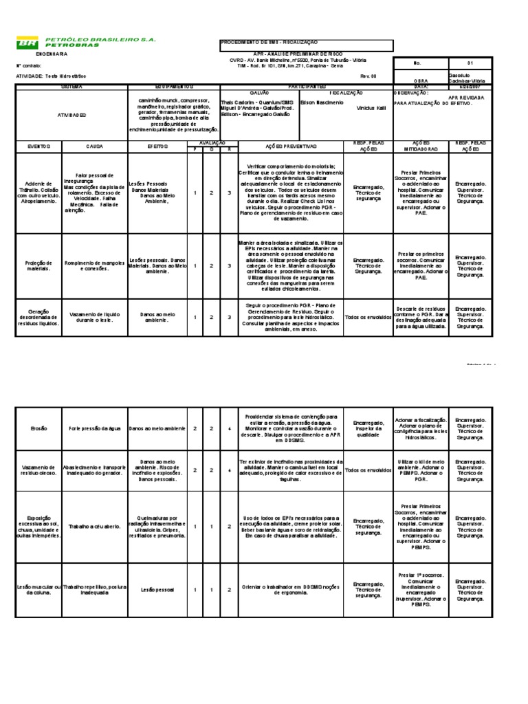 Seguir o procedimento PGR - Plano de Gerenciamento de Resíduo. Seguir o procedimento para teste hidrostático. Consultar planilha de aspectos e impactos ambientais, em anexo. |