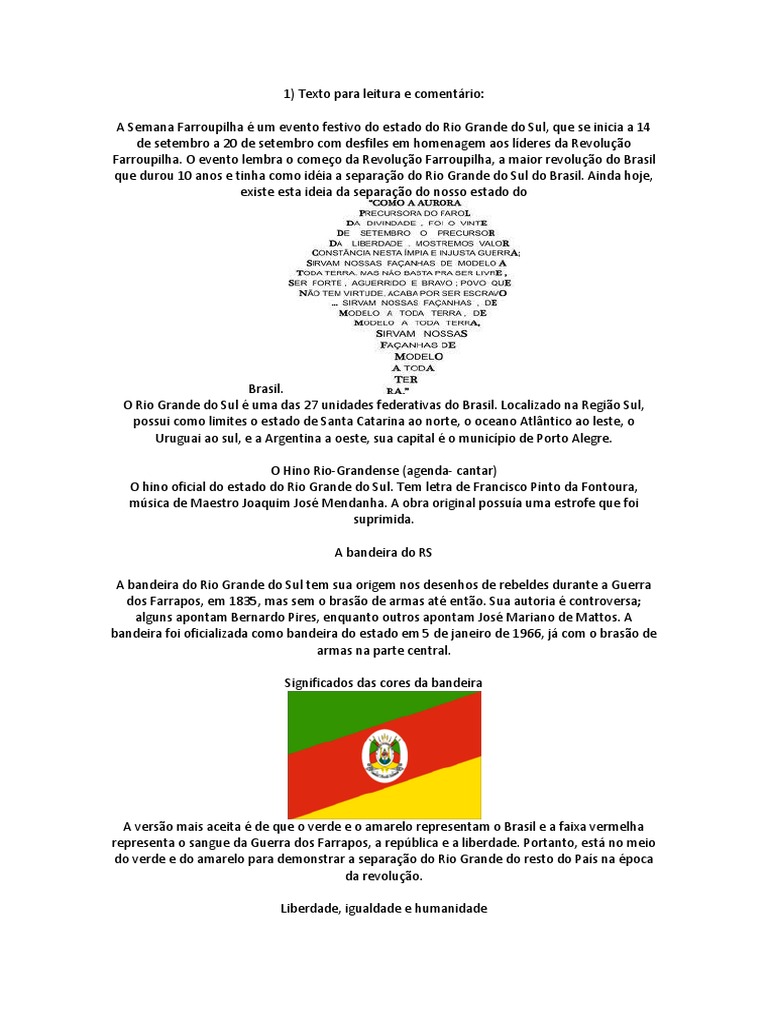 1) Texto para leitura e comentrio: A Semana Farroupilha um evento festivo do estado do Rio Grande do Sul, que se inicia a 14 de setembro