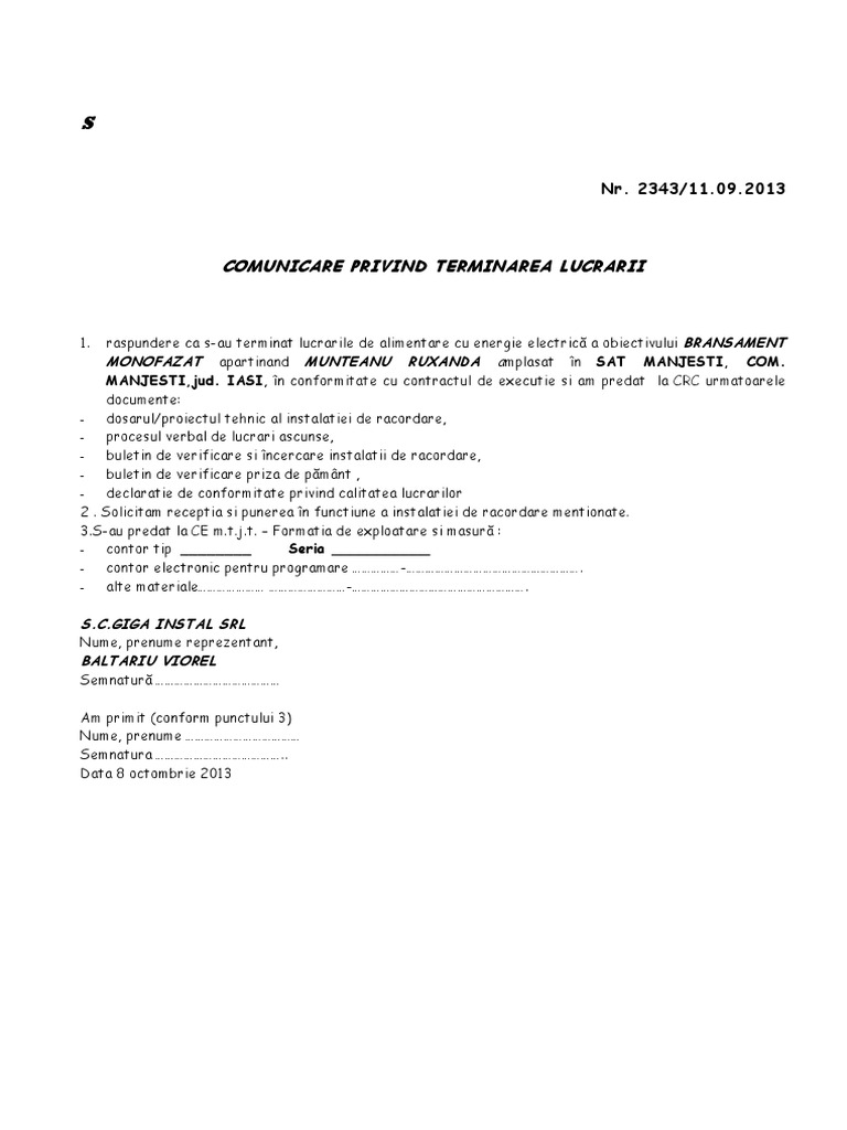 raspundere ca s-au terminat lucrarile de alimentare cu energie electric a obiectivului BRANSAMENT MONOFAZAT apartinand MUNTEANU RUXANDA amplasat n SAT MANJESTI, COM. MANJESTI,jud. IASI, n conformitate cu contractul de executie si am predat la CRC urmatoarele documente: - dosarul/proiectul tehnic al instalatiei de racordare, - procesul verbal de lucrari ascunse, - buletin de verificare si ncercare instalatii de racordare, - buletin de verificare priza de pmnt , - declaratie de conformitate privind calitatea lucrarilor 2 . Solicitam receptia si punerea n functiune a instalatiei de racordare mentionate. 3.S-au predat la CE m.t.j.t. Formatia de exploatare si masur : - contor tip ________ Seria ___________ - contor electronic pentru programare -. - alte materiale -. 1.