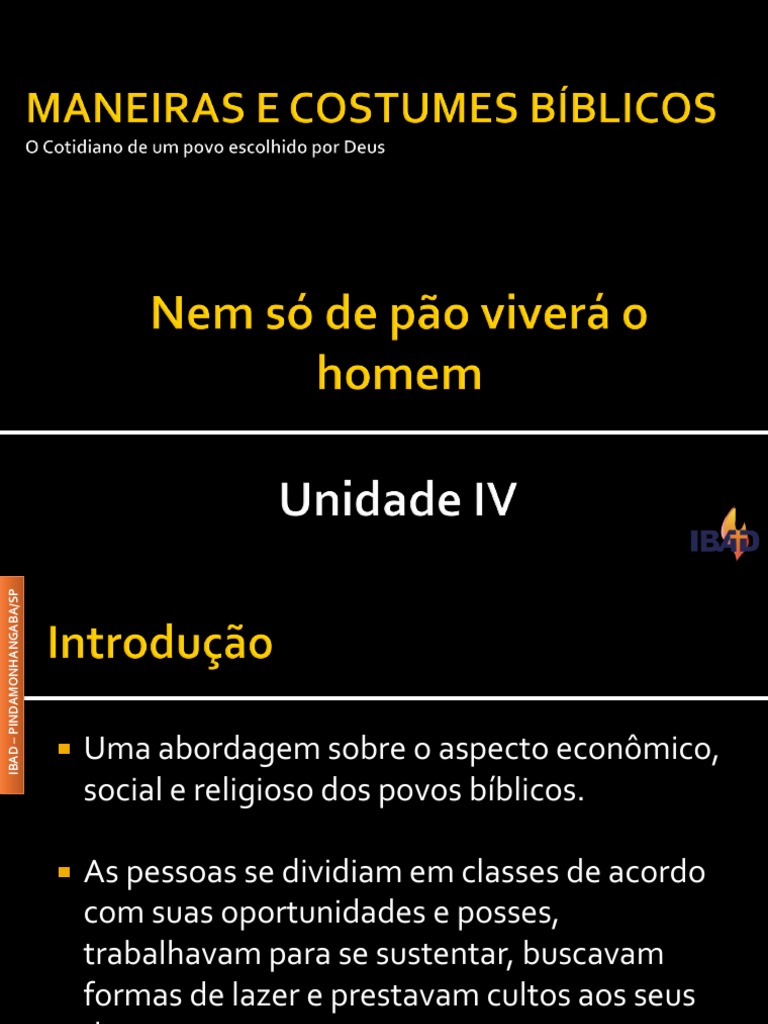 Uma abordagem sobre o aspecto econmico, social e religioso dos povos bblicos. As pessoas se dividiam em classes de acordo com suas oportunidades e posses, trabalhavam para se sustentar, buscavam formas de lazer e prestavam cultos aos seus deuses.