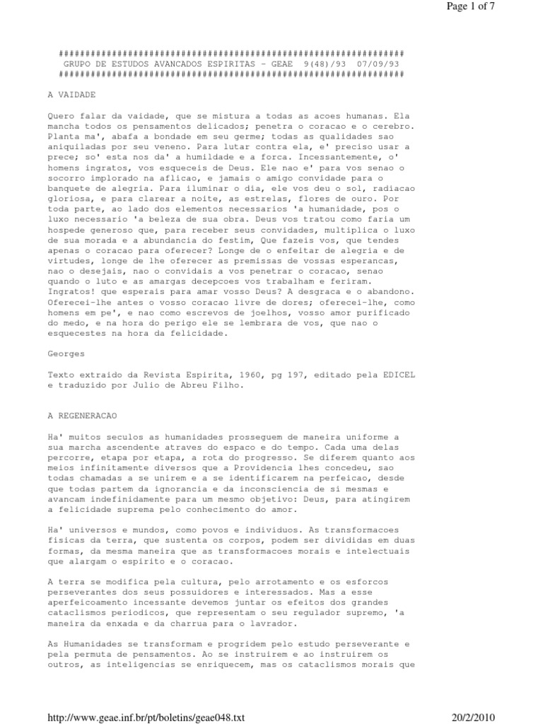 ############################################## GRUPO DE ESTUDOS AVANCADOS ESPIRITAS - GEAE E. mail: Jose Cid: jac14@po.cwru.edu ##############################################