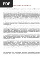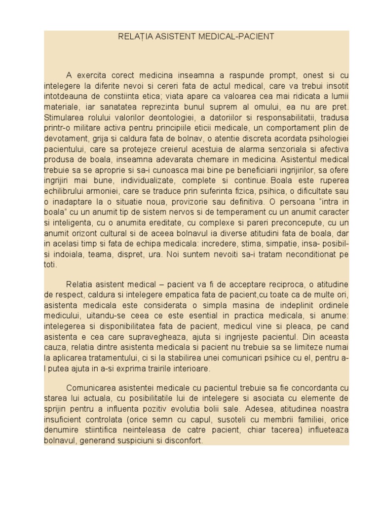 A exercita corect medicina inseamna a raspunde prompt, onest si cu intelegere la diferite nevoi si cereri fata de actul medical, care va trebui insotit intotdeauna de constiinta etica; viata apare ca valoarea cea mai ridicata a lumii materiale, iar sanatatea reprezinta bunul suprem al omului, ea nu are pret. Stimularea rolului valorilor deontologiei, a datoriilor si responsabilitatii, tradusa printr-o militare activa pentru principiile eticii medicale, un comportament plin de devotament, grija si caldura fata de bolnav, o atentie discreta acordata psihologiei pacientului, care sa protejeze creierul acestuia de alarma senzoriala si afectiva produsa de boala, inseamna adevarata chemare in medicina. Asistentul medical trebuie sa se aproprie si sa-i cunoasca mai bine pe beneficiarii ingrijirilor, sa ofere ingrijiri mai bune, individualizate, complete si continue. Boala este ruperea echilibrului armoniei, care se traduce prin suferinta fizica, psihica, o dificultate sau o inadaptare la o situatie noua, provizorie sau definitiva. O persoana intra in boala cu un anumit tip de sistem nervos si de temperament cu un anumit caracter si inteligenta, cu o anumita ereditate, cu complexe si pareri preconcepute, cu un anumit orizont cultural si de aceea bolnavul ia diverse atitudini fata de boala, dar in acelasi timp si fata de echipa medicala: incredere, stima, simpatie, insa- posibilsi indoiala, teama, dispret, ura. Noi suntem nevoiti sa-i tratam neconditionat pe toti. Relatia asistent medical pacient va fi de acceptare reciproca, o atitudine de respect, caldura si intelegere empatica fata de pacient,cu toate ca de multe ori, asistenta medicala este considerata o simpla masina de indeplinit ordinele medicului, uitandu-se ceea ce este esential in practica medicala, si anume: intelegerea si disponibilitatea fata de pacient, medicul vine si pleaca, pe cand asistenta e cea care supravegheaza, ajuta si ingrijeste pacientul. Din aceasta cauza, relatia dintre asistenta medicala si pacient nu trebuie sa se limiteze numai la aplicarea tratamentului, ci si la stabilirea unei comunicari psihice cu el, pentru al putea ajuta in a-si exprima trairile interioare. Comunicarea asistentei medicale cu pacientul trebuie sa fie concordanta cu starea lui actuala, cu posibilitatile lui de intelegere si asociata cu elemente de sprijin pentru a influenta pozitiv evolutia bolii sale. Adesea, atitudinea noastra insuficient controlata (orice semn cu capul, susoteli cu membrii familiei, orice denumire stiintifica neinteleasa de catre pacient, chiar tacerea) influeteaza bolnavul, generand suspiciuni si disconfort.